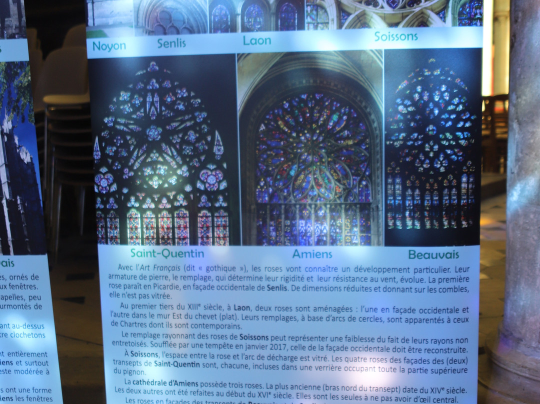 这次让我印象特别深刻的是一些法语标语牌,上面展示了皮卡第七座大教堂(桑利斯、拉昂、圣康坦、苏瓦松、博韦、亚眠和努瓦永)的特色,并比较了玻璃玫瑰窗、立面、柱子、拱形天花板、框架、回廊(半圆形,向东辐射,带有回廊和小教堂(我之前不知道))以及它们的平面图。