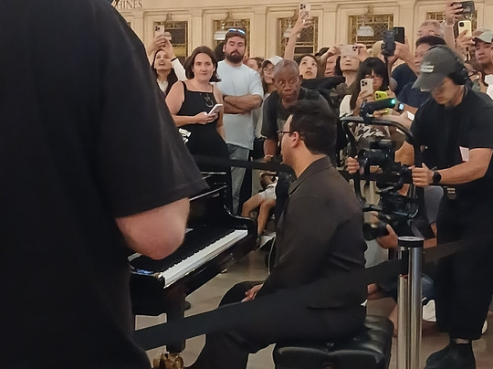 翻译:这是我们第二次来这里。第一次是在2024年,当时我们想参加导览团,但去晚了,票已经卖完了。所以我们决定下次再来。可惜的是,我因为膝盖疼痛无法参加,所以只有我丈夫参加了导览。但他把一切都讲解给我听,感觉就像我和他一起在现场一样。我们到的时候,主厅钟楼前摆着一架钢琴。我们经常在网上看一些“惊喜”视频,里面有音乐家在各种地方演奏,所以我们觉得这里也会有类似的场景。大约两个小时后,惊喜真的出现了,所以我们趁这段时间在美食广场吃了晚饭。一位年轻的钢琴家,茱莉亚音乐学院的学生,演奏了格什温的《蓝色狂想曲》,这是我最喜欢的作曲家之一。这又是我们这次旅行中一次非常棒的体验。