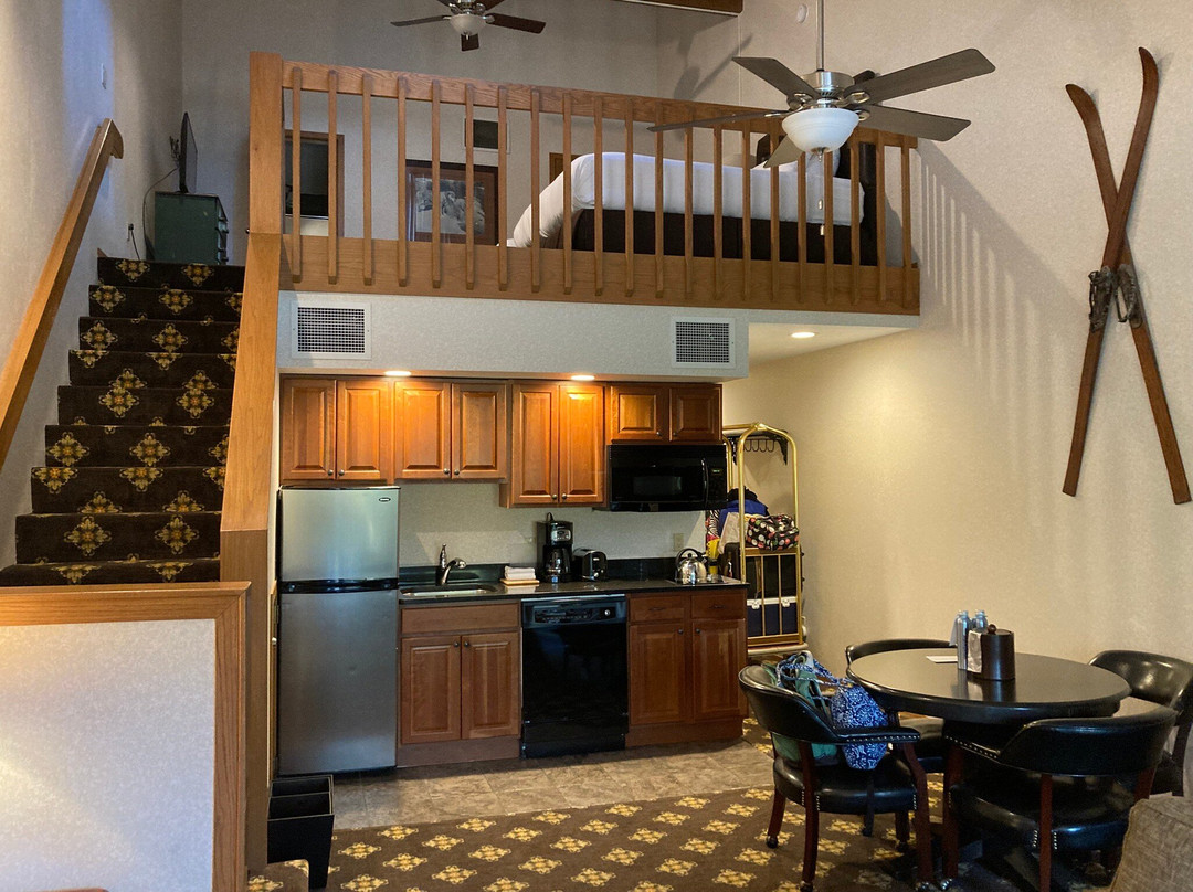 我们的房间非常宽敞,主卧有一张特大床,配有双洗手池、淋浴间、客厅、餐厅和小厨房,小厨房配有全尺寸冰箱、微波炉(可烘烤)、洗碗机和双眼炉灶。阁楼区有两张全尺寸床和另一个全尺寸浴室。足够 8 个人睡觉了!!!!我们非常享受打喜马拉雅高尔夫的乐趣,在麦基诺岛待了一天,游览了附近的几个小镇,欣赏了美丽的日落!!