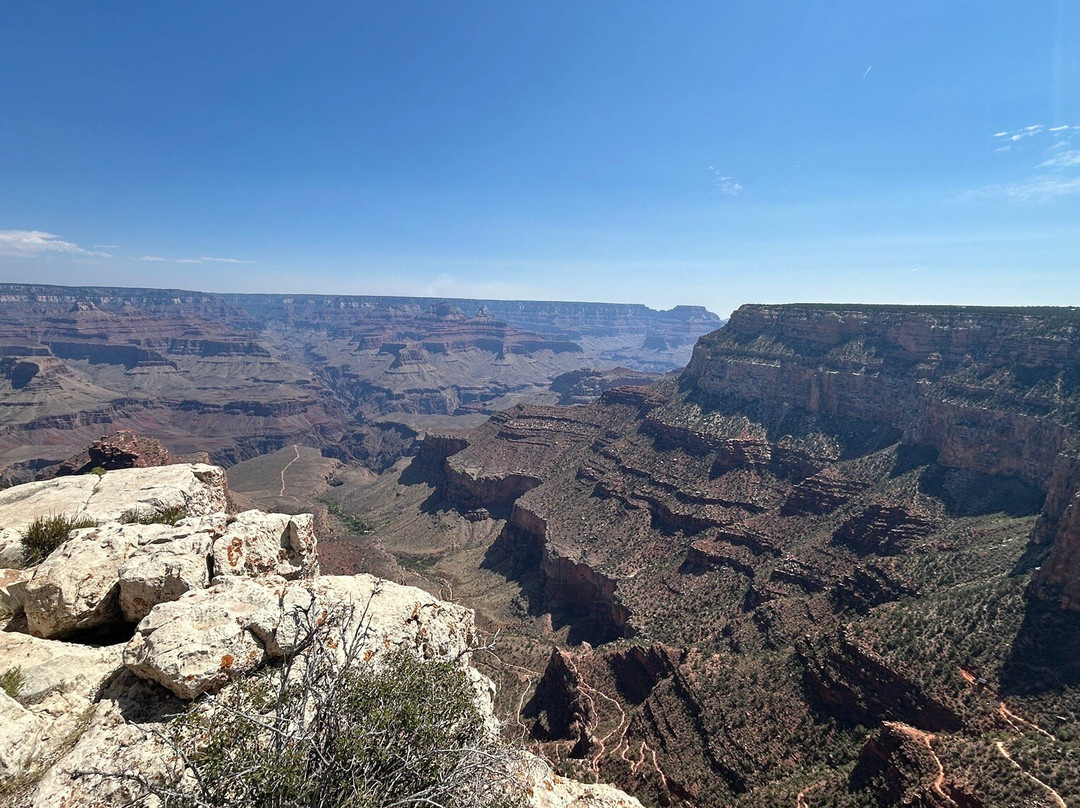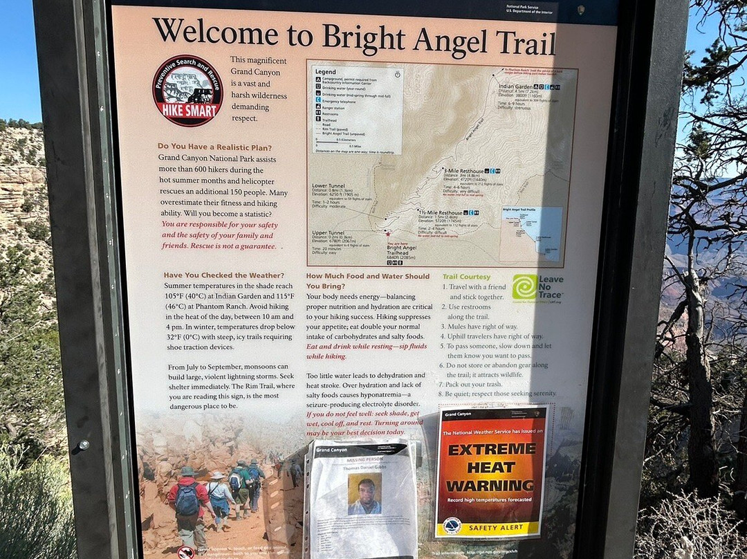 点评:August at the Grand Canyon was a pretty great time to be there. Yeah, it got hot by mid-day but if you get up early and get in the park and hike down about a mile before 10 AM, it makes for a great experience without the spring and fall crowds. Wear walking shoes!!Be very responsible if you walk down to the first bathroom…it is a serious effort to walk back out and if you are not generally fit you become a danger and a burden for park ranges rescue squad. 100% carry more water than you think you need if you hike down for 30+ minutes . Guided tours will help you learn more and spot petroglyphs…I was with someone that had knowledge and could point them out, so we didn’t do a guided hike. The rim trail is a mix of paved and pea gravel and you can hop on and off the busses as well. The wind was significant at the rim so hold tight to your belongs(hat/sunglasses/small kids).