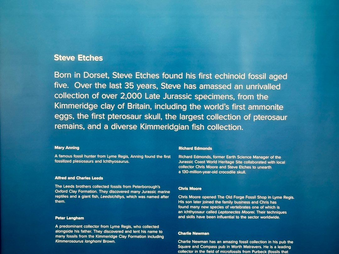 如果您是大卫·爱登堡爵士的粉丝,并且看过《爱登堡与巨型海怪》,那么您一定会想来这里参观,因为上龙头骨是在当地发现的,所以展览品还算不错。我之前听说过埃切斯收藏馆,也住在附近,但从未去过,是看了爱登堡的节目后,我和我丈夫才决定去参观……您绝对不会后悔来这里一趟。