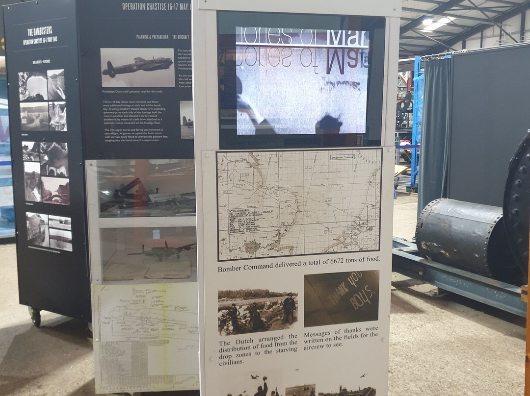此外,还有由 Barnes Wallis 设计的原始弹跳炸弹,一个展示 Guy Gibson 的原始兰开斯特飞机的仪表板和控制柱的显示器。还有一个视频解说展示,解释了“玛娜行动”,这是第二次世界大战最后一周皇家空军兰开斯特飞机向饥饿的荷兰人民空投急需的援助的至关重要的紧急行动……