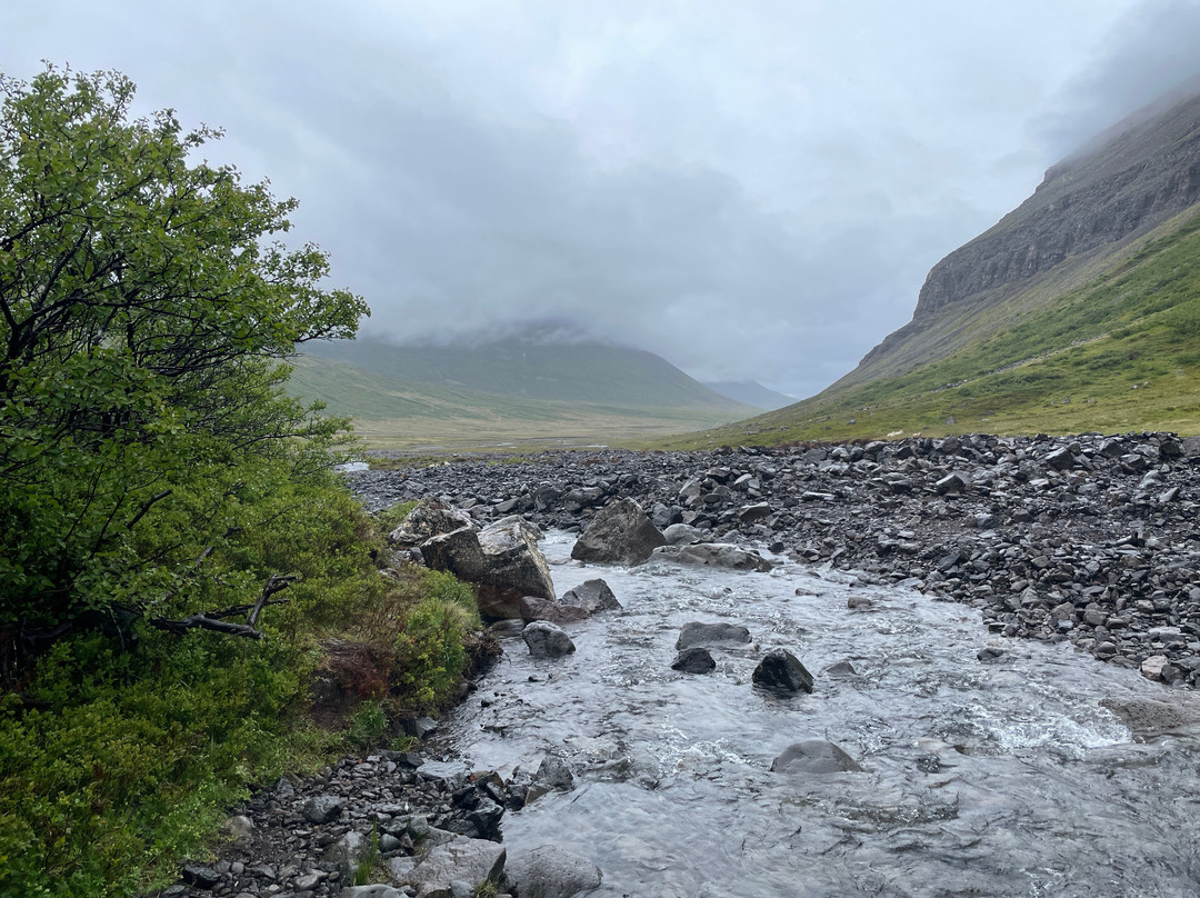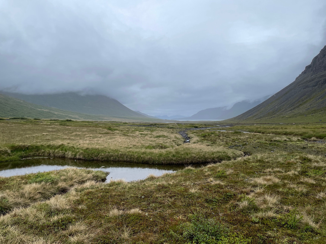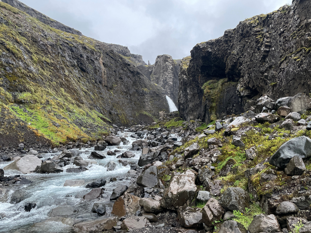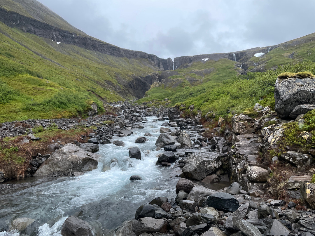 The trail to the falls begins at the carpark directly off Route 61 south of Súðavík. You walk through a valley, river raven and scrubby areas eventually into a boulder filled canyon leading to the Valagil Falls. The trail is around 8km out-and-back. You'll see lots of Artic terns and other birdlife throughout.