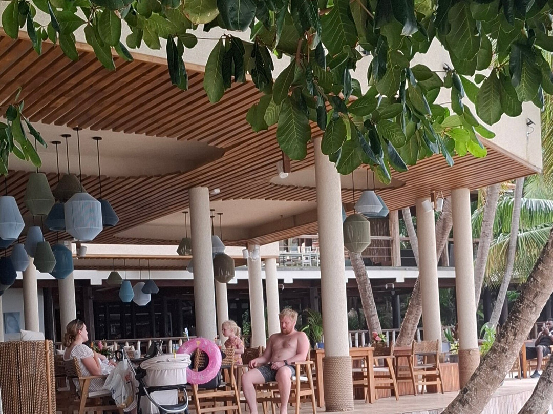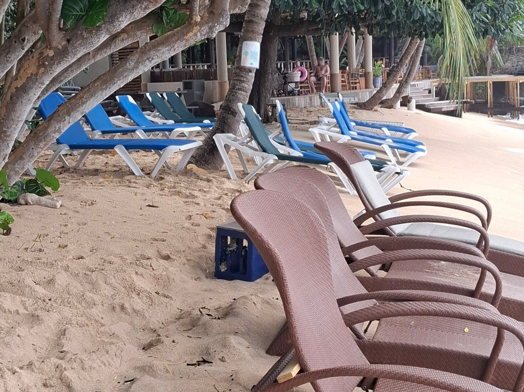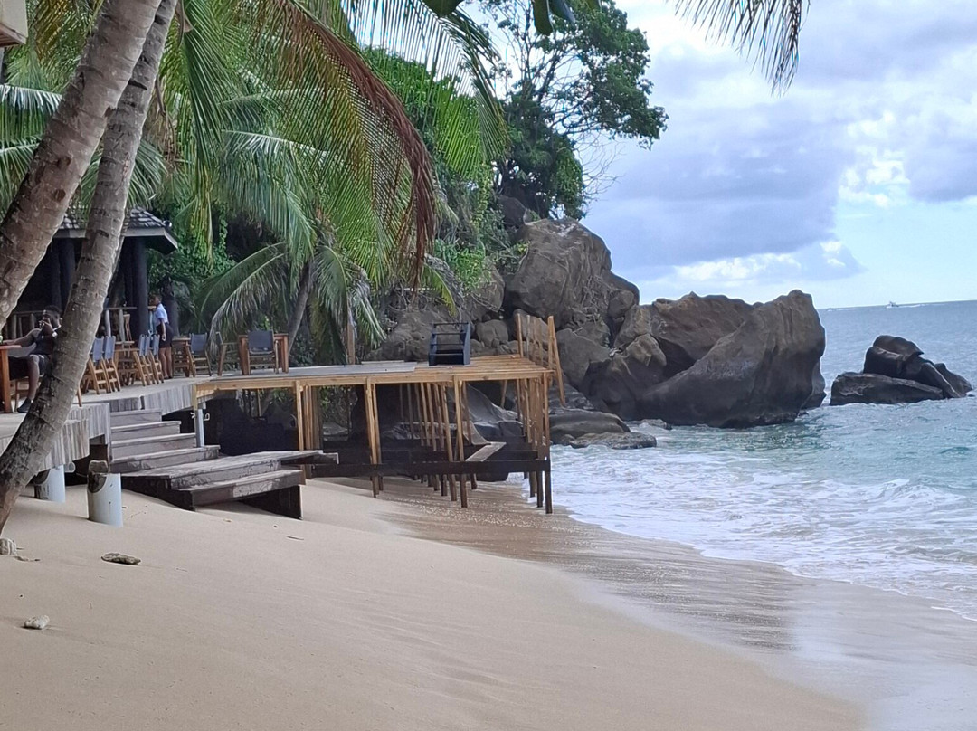 海滩远端的悬崖和岩石旁是水族馆酒吧/餐厅,有两层楼和木制阳台。这里有许多日光浴床供顾客使用。