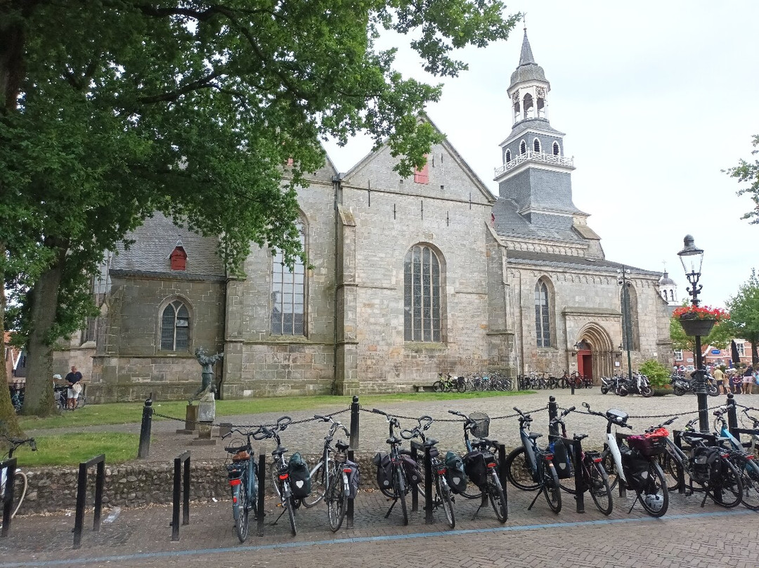 点评:Reeds midden 12e eeuw wordt er melding gemaakt van een kerk in Ootmarsum, die echter eind 12e eeuw door vijandelijke Drentse troepen werd verwoest. Midden 13e eeuw begon men met de bouw van een nieuwe kerk en legde men de basis van de huidige kerk, de rooms-katholieke HH. Simon en Judaskerk. Deze driebeukige kerk met twee zijbeuken en driezijdig gesloten koor is gebouwd in de bouwstijl Westfaalse romano-gotiek. Men trok de kerk op in Bentheimer zandsteen. Tot in de 19e eeuw vonden er verbouwingen plaats, waarbij nieuwe elementen vaak de bouwstijl neo-gotiek tonen. Oorspronkelijk had de Simon en Judas-kerk een zware, vierkante toren van zandsteen. In 1842 werd deze romaanse toren vanwege bouwvalligheid gesloopt. Jammer hoor. Ter vervanging plaatste met op het voordak van het schip een flinke dakruiter met lantaarn. Op zich een sierlijke opbouw, maar qua stijl detoneert hij enigszins met schip en koor. Enfin .. Het interieur van de kerk is voornamelijk 19e eeuws. Naast de hoofdingang een erg mooi zanstenen doopbekken, mogelijk 13e eeuws. In 1626 werd de kerk geconfisqueerd door de hervormden. Die bleven de kerk tot 1810 gebruiken. In dat jaar werd de kerk onder druk van de Franse bezetter teruggegeven aan de katholieke gemeenschap. De hervormden bouwden een nieuwe, veel kleinere kerk op de Ganzenmarkt. De HH. Simon en Judaskerk is erg mooi, vooral ook door de romaanse uitstraling die ondanks verbouwingen nog duidelijk zichtbaar is.