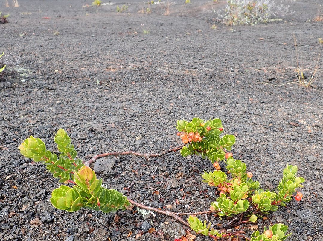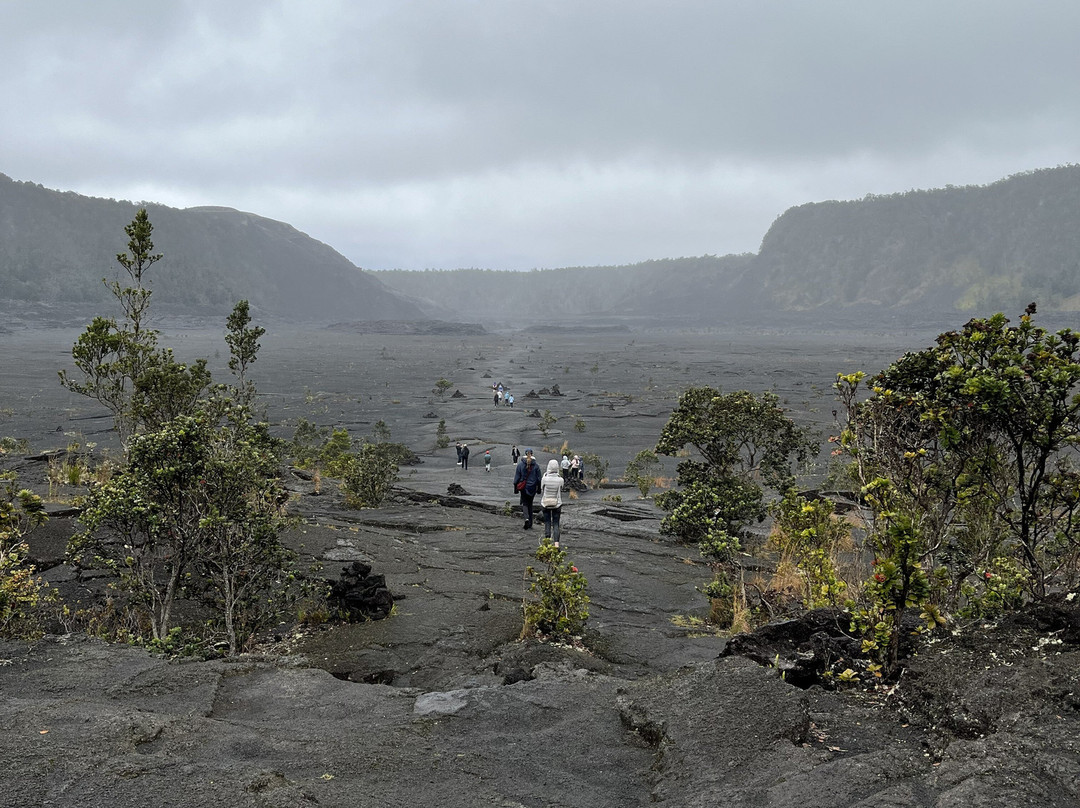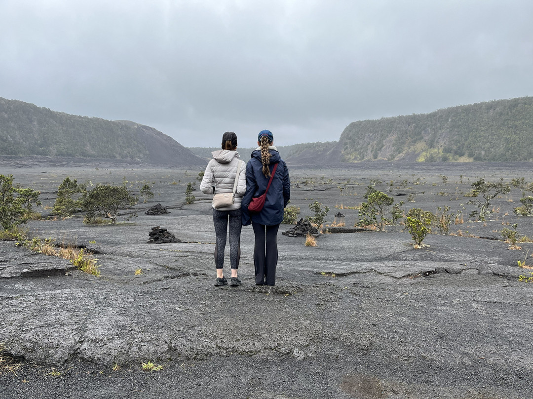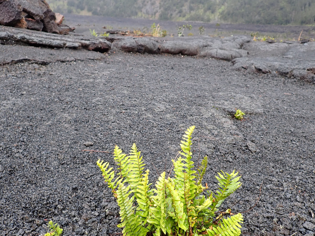 翻译:徒步穿越基拉韦厄伊基火山灰暗破碎的火山口,而几公里外的基拉韦厄哈雷茂茂火山仍在冒着浓烟,这真是一次难忘的体验。只要你仔细观察,就能发现它曾经遭受猛烈撞击的痕迹,以及生命在最恶劣的环境中顽强生存的能力。我们穿越火山口时,偶尔会遇到毛毛细雨,我想这总比炎热的晴天要好得多。火山口内温度会非常高,所以最好在早上前往。步道东西走向,我强烈建议从东端下山,然后从西端上山。东端的步道蜿蜒而下,穿过一片茂密的森林,森林里到处都是阿帕帕尼吸蜜鸟的鸣叫声(偶尔还能听到阿玛基希鸟的叫声)。你可能会觉得上山的路比较轻松,但实际上路程很长,我们遇到的上山的徒步者总是问“什么时候才能到头?”。虽然坡度不算陡,但每一步都是向上,所以感觉非常漫长。