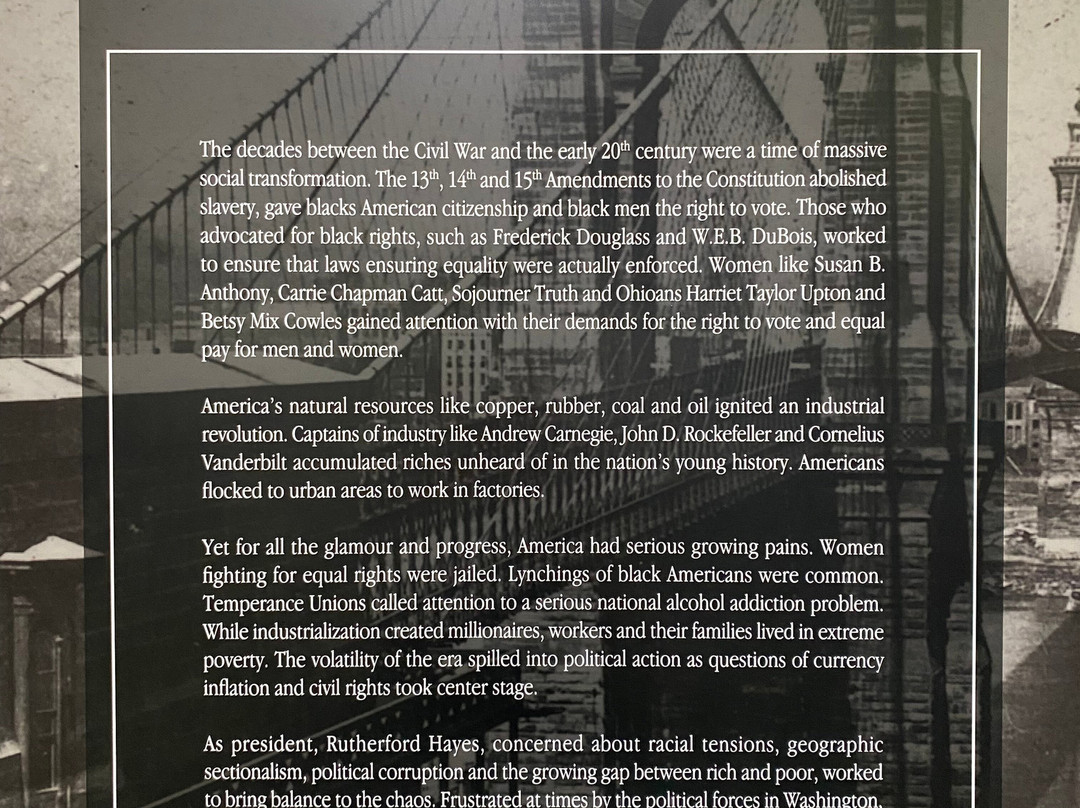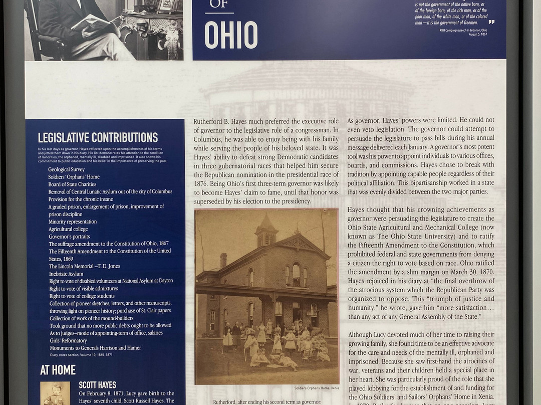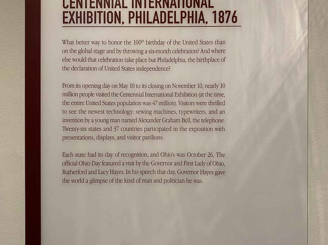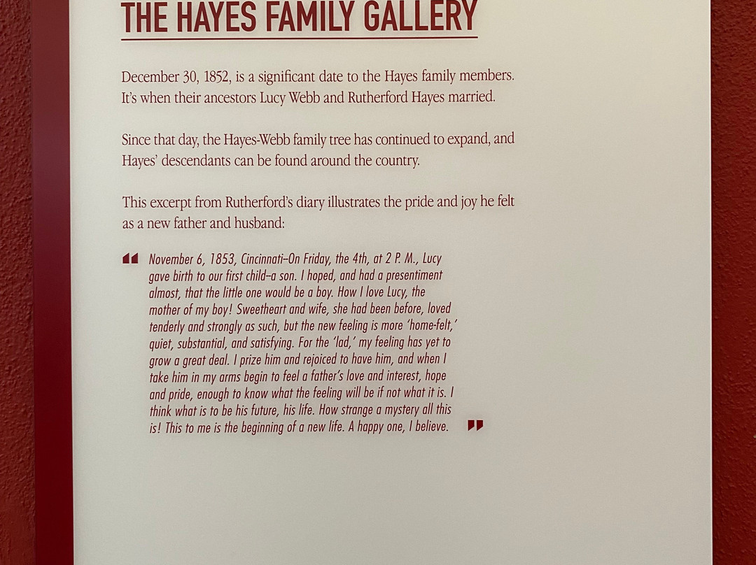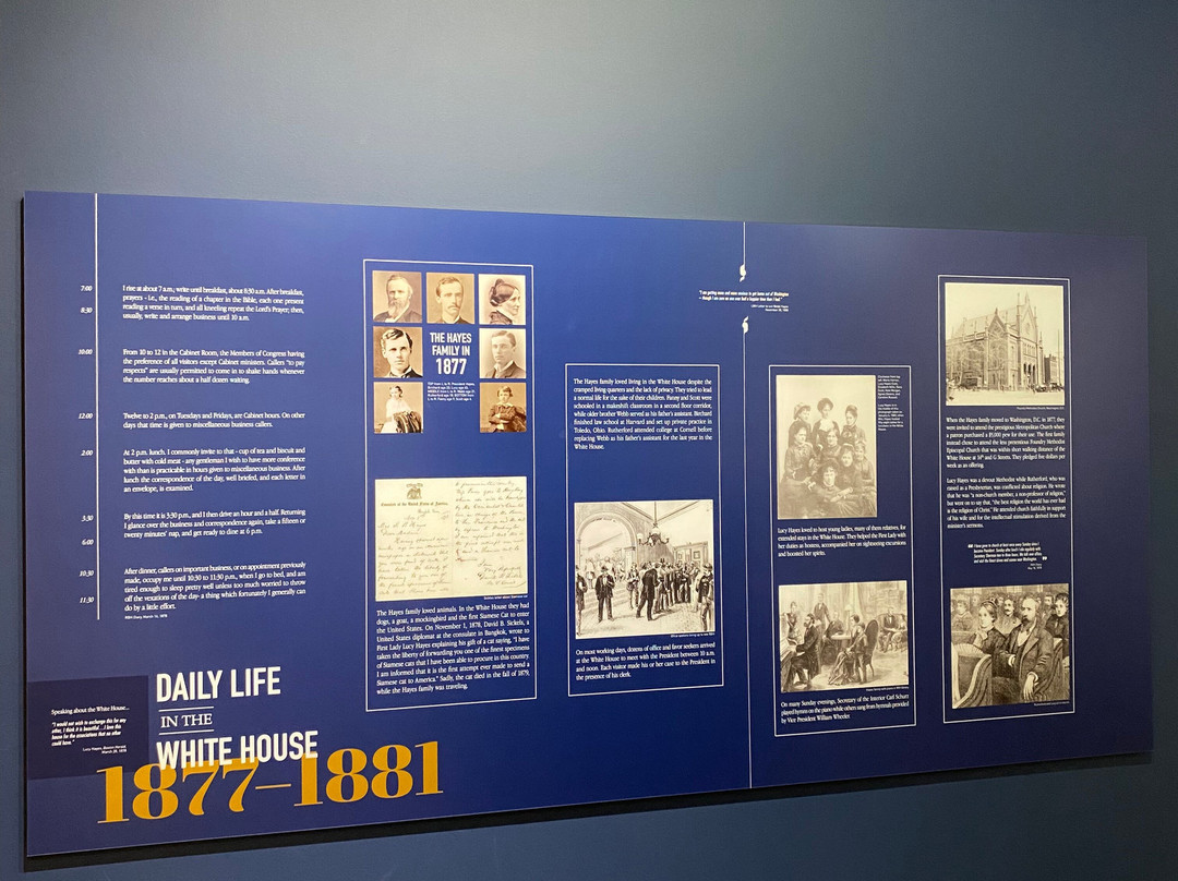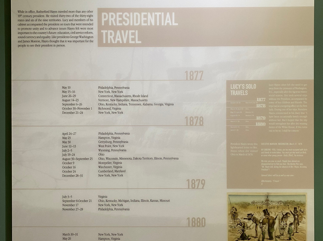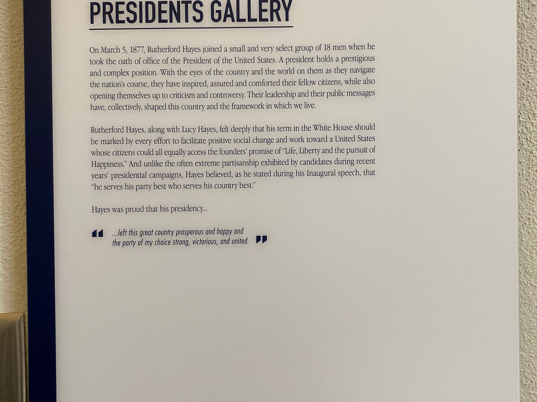 点评:Great trip. We arrived at approximately 12 pm and made our way towards the entrance of the museum. After paying the admission fee, we received a quick overview of the site and began to explore the museum. The museum consisted of several levels, including the ground floor and basement. There were informational plaques scattered throughout the museum, that went into detail about President Hayes life and his contributions to society as President. There were also multiple artifacts out for display as well, that related in some way, shape or form to President Hayes. The basement level focused on his early life, and the ground floor of the museum focused on his life as President. There was also a small section located towards the back of the museum that focused on his family life. The informational plaques were very text heavy and took a lot of time to get through. The site also hosted guided tours of President Hayes house, which was directly next to the museum. The tour of the house lasted roughly an hour and the tour guide took us from room to room, highlighting important features and telling us stories of the President and his family.