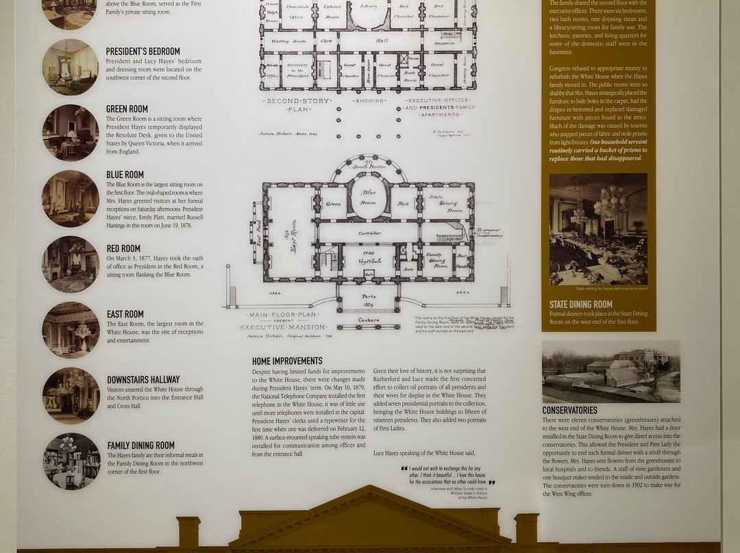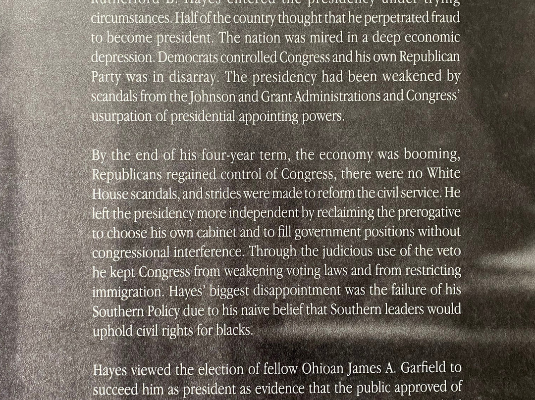 翻译:很棒的旅行。我们大约在中午 12 点到达,然后朝博物馆入口走去。支付入场费后,我们快速浏览了一下现场,然后开始探索博物馆。博物馆由几层组成,包括一楼和地下室。博物馆各处都散布着信息牌匾,详细介绍了海斯总统的生平及其作为总统对社会的贡献。还有多件文物展出,在某种程度上与海斯总统有关。地下室主要介绍他的早年生活,博物馆一楼主要介绍他作为总统的生活。博物馆后面还有一小块区域介绍他的家庭生活。信息牌匾上有很多文字,需要花很多时间才能看完。该遗址还举办了海斯总统故居的导游服务,该故居就在博物馆旁边。故居之旅持续了大约一个小时,导游带我们从一个房间到另一个房间,重点介绍重要特色,并向我们讲述总统及其家人的故事。