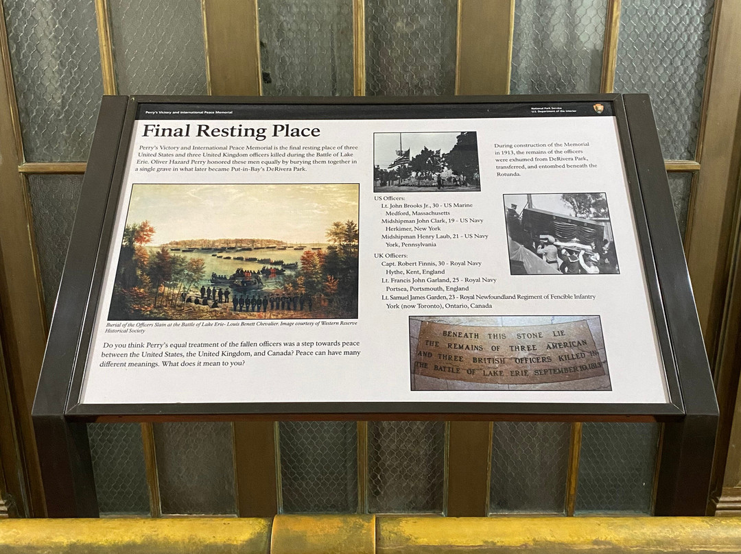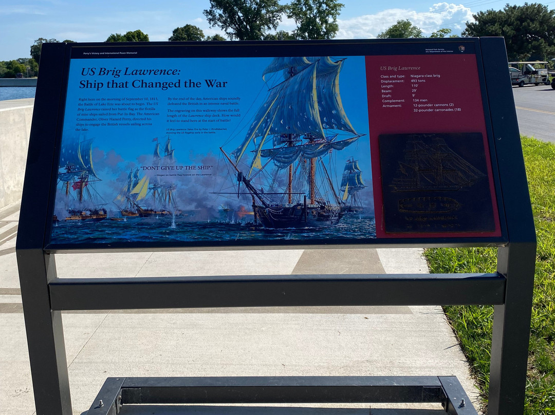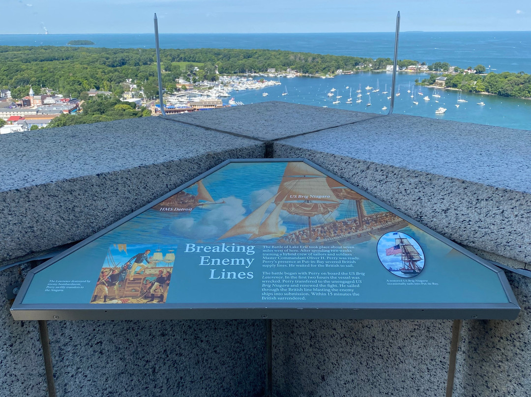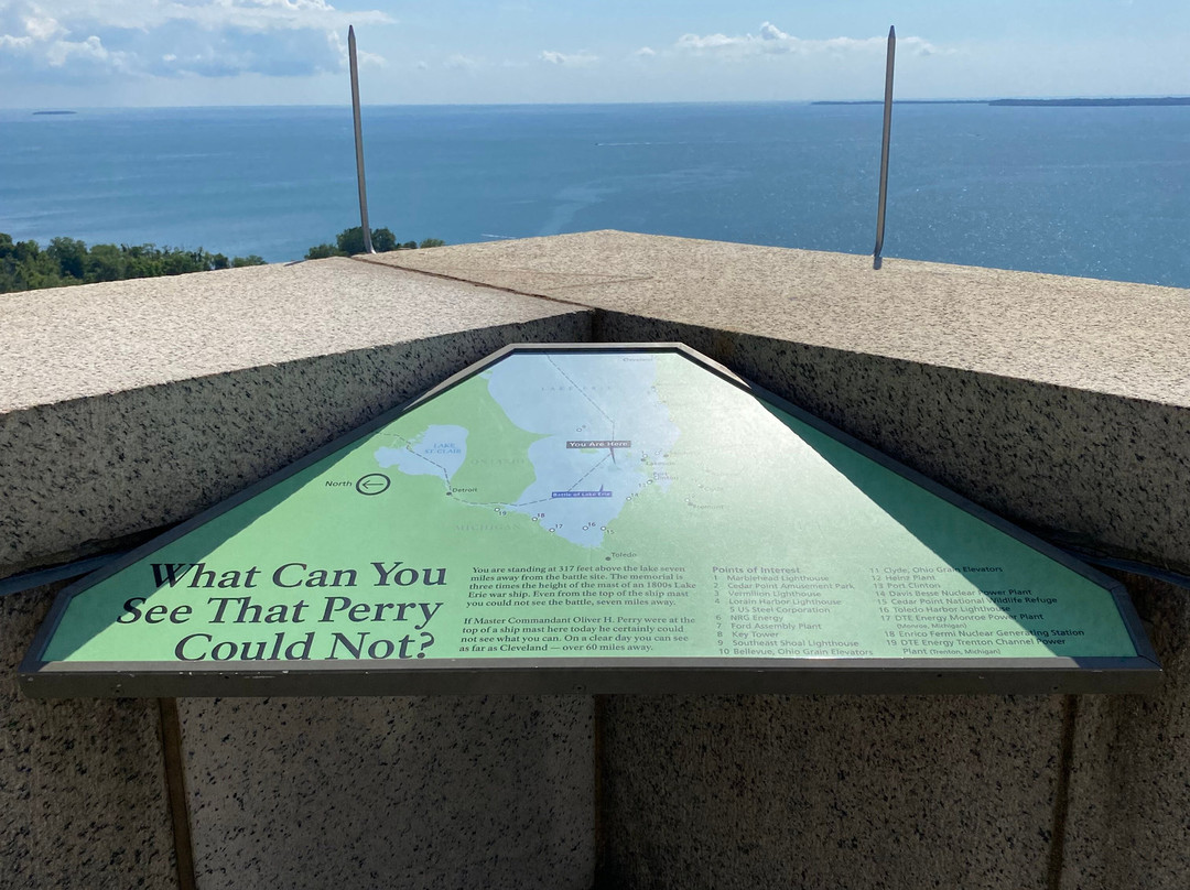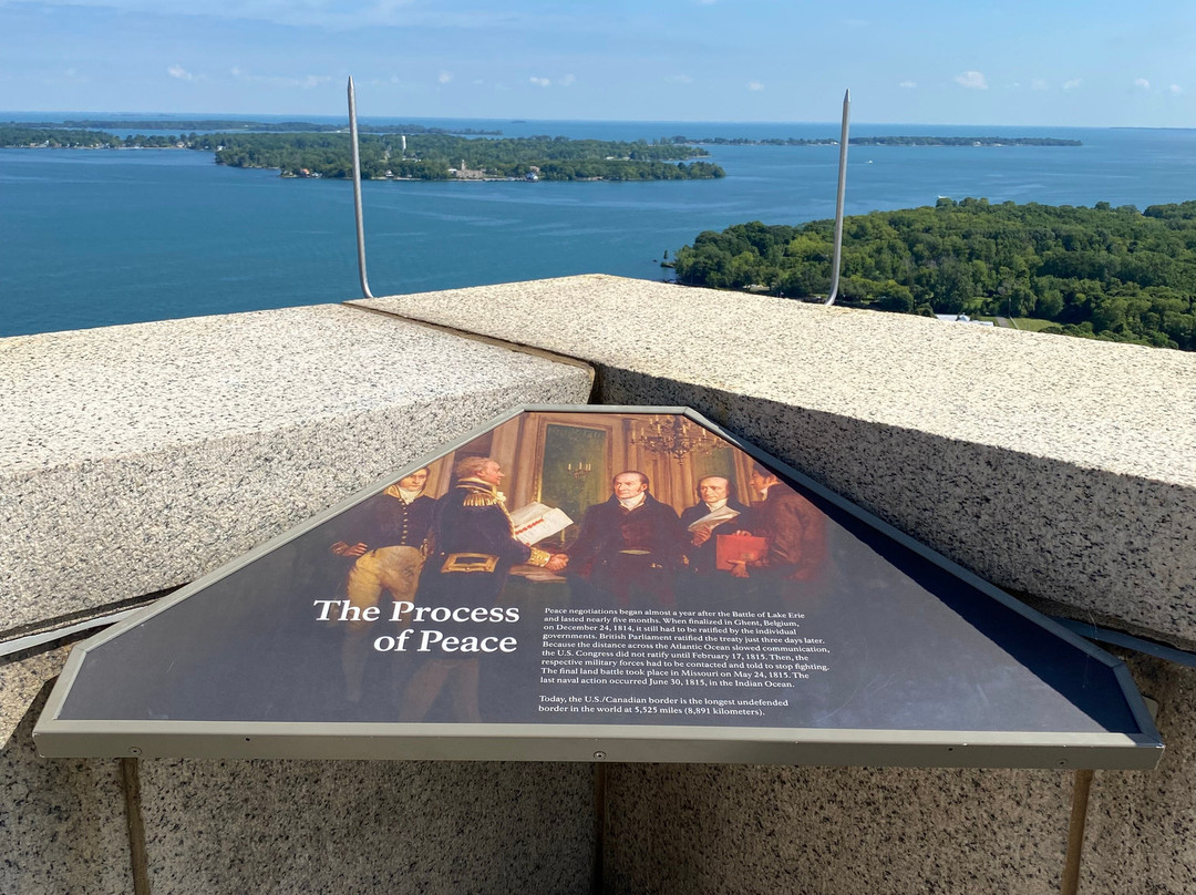 点评:Great trip. We arrived at approximately 10 am and made our way towards the entrance of the visitor center. We were able to purchase timed tickets for 10:45 am to view the top of the International Peace Memorial. After buying our tickets, we decided to explore the indoor exhibits. There were multiple informational plaques and artifacts out for display, that went over the War of 1812 and the events that transpired that day. There was also a short 15 minute movie playing throughout the day that went into detail about Commodore Oliver Hazard Perry’s contributions to the War of 1812 and how the war originated in the first place. There was a small gift shop and restrooms available inside the visitor center as well. After viewing the indoor exhibits, we made our way outside to the International Peace Memorial. The attendant checked our tickets and we waited in a short line to take the next available elevator to the top of the monument. Once at the top, we were able to enjoy picturesque views of Lake Erie and even Canada. There were several more informational plaques at the top of the monument that talked about the War of 1812 and the various landmarks visible at the top of the monument. There were multiple park rangers at both the visitor center and International Peace Memorial that were willing to answer any questions that we may have had.