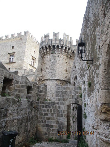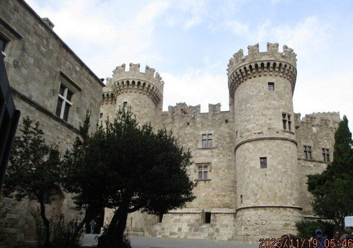 翻译:这座宫殿是希腊哥特式建筑的罕见范例,其风格深受1125年前后欧洲十字军东征的影响。形似主教冠的经典哥特式拱门在罗德岛十分罕见,因为罗马拱门通常是圆形的。这里曾是圣约翰骑士团(医院骑士团)的要塞,集宫殿、总部和堡垒于一体。在古希腊时期,这里是太阳神赫利俄斯的神庙所在地,也可能是著名的罗马巨像的所在地。这座宫殿最初建于公元7世纪末,是一座拜占庭式要塞。
