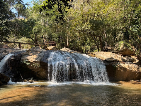 步道蜿蜒而上,全长两公里多,海拔上升约250米,沿着湄沙溪流而行,溪水时而潺潺流淌,时而奔腾咆哮。这条小径穿过茂密的热带雨林,连接着十个各具特色的瀑布——有的宽阔宁静,有的气势磅礴,令人叹为观止。