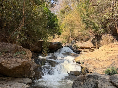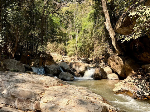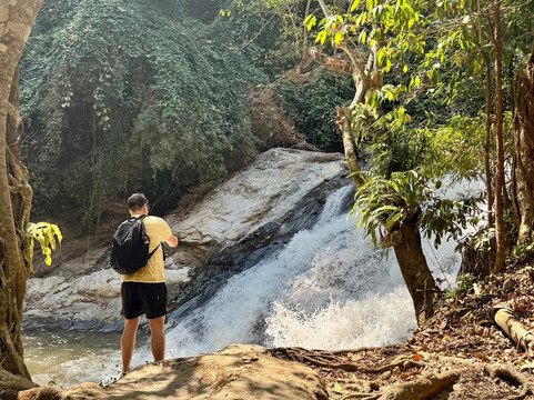 The trail climbs just over two kilometers with around 250 meters of elevation gain, winding alongside the Mae Sa stream as it shifts from gently meandering to powerfully cascading. The path takes you through dense tropical forest and connects ten different waterfalls, each with its own character — some wide and serene, others energetic and dramatic.