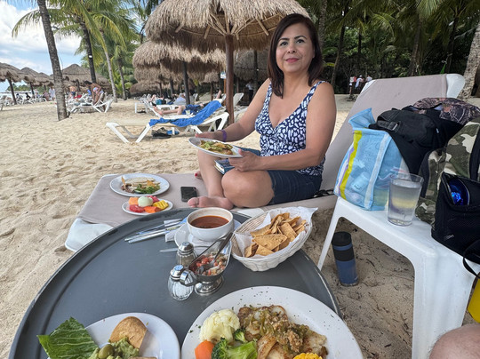 翻译:2025年12月26日在Nachi Cocom度过了美好的时光。如果您正在寻找一个安静舒适的海滩度假村,这里就是您的理想之选。如果您喜欢热闹的音乐或充满沙滩玩具的派对氛围,可以去隔壁的Mr. Sanchos或Paradise Beach Club。我们花了20美元打车到达,一进门就受到了热情接待,还被专业地拍了照片。我们选了一个高于沙滩的茅草凉亭下的位置。David帮我安排了一个小时的按摩,Jose是我们的服务员,在我享受经验丰富的按摩师提供的优质按摩服务时,他不停地给我妻子送帕洛玛鸡尾酒!