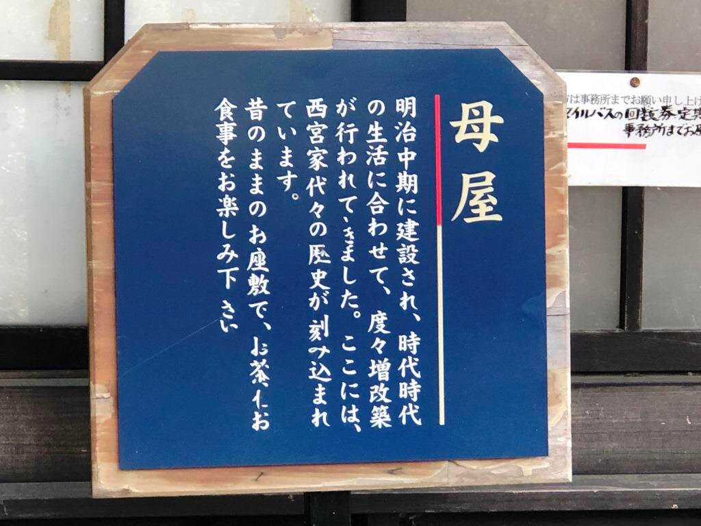 “西宫家”有五间库房和一栋主楼。入口左侧是前仓。 “前藏”是一座建于1919年的二层仓库,是茶话会、俳句聚会以及各界人士的演讲和展览的社区空间。它的后面是Gakko仓库,这是一个长期以来用来存放gakko(酱菜)的小仓库。从春季到秋季,我们主要销售“Gakko”(腌菜),但也销售农产品。营业时间为10:00至16:30。