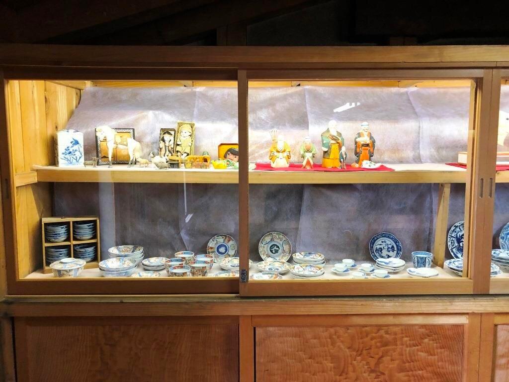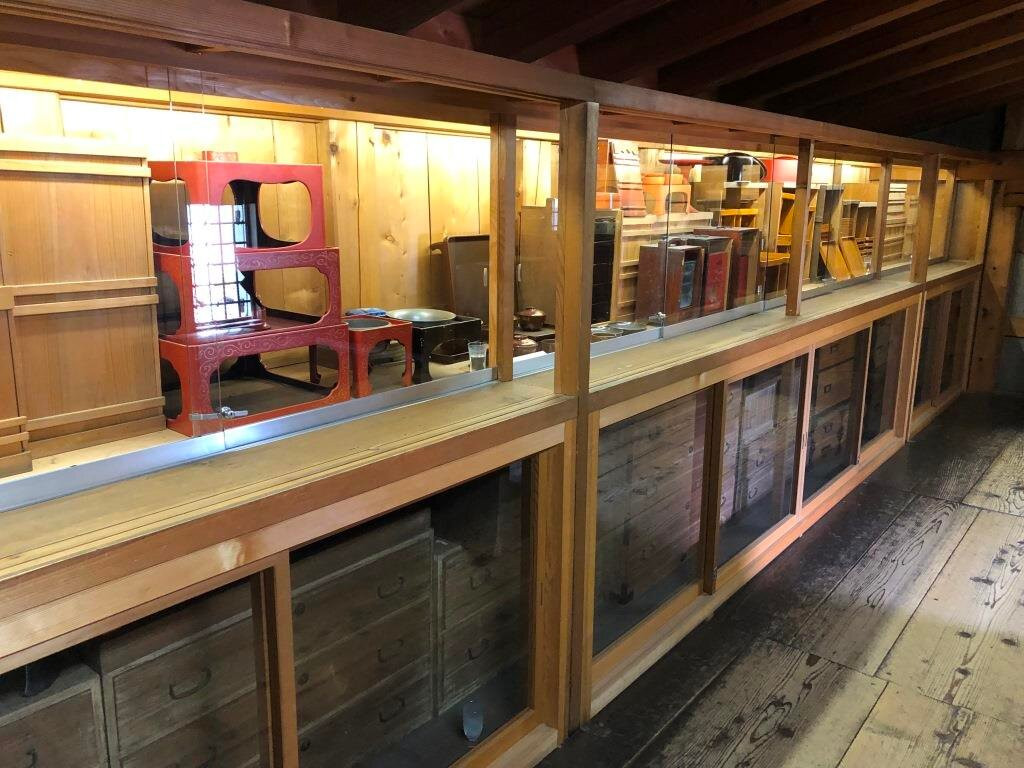 「ガッコ蔵」の前には、「母屋」があり、レトロな雰囲気の中で、飲み物や甘いものを楽しむことができる甘味・お食事処です。その隣にあるのが「文庫蔵」です。「文庫蔵」は、西宮家で最も古い蔵で明治27年(1894年)に上棟した二階建ての蔵です。現在は途絶えてしまった角館春慶塗りや西宮家に伝わる文化遺産の収蔵品を多数を展示しております。特に、「文庫蔵」の扉は、昔の栄華を思わせる重厚感があり、存在感が抜群でした。