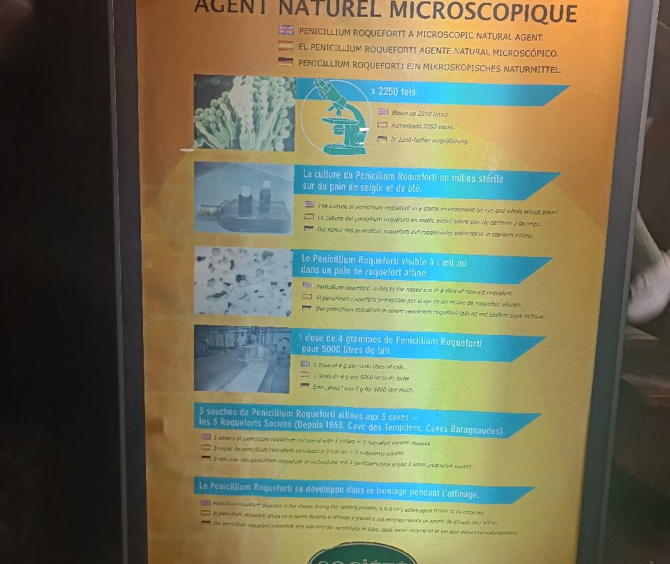 点评:Reçu ce dimanche en 2 groupes nous avons découvert et appris comment était fabriqué le roquefort (Société). Après visionnage de films explicatifs et commentaires de notre guide , nous avons découvert un dédale de galeries, passages,salles d'affinage escaliers menant a plusieurs niveaux et bien sûr dégusté un excellent roquefort ou plutôt différentes variétés. Nous sommes repartis les uns et les autres avec d'excellents produits. N'hésitez pas à venir visiter ce lieu qui semble petit extérieurement mais qui est tellement immense que on ne sait plus à quel niveau on se trouve. Un vrai labyrinthe. Ensuite petit resto au Cambalou situé dans le village. Très bon repas simple mais copieux et bonne cuisine. (Attention pas ouvert en permanence). N'oubliez pas d'aller visiter les vestiges de la petite chapelle St Pierre, avec un superbe point de vue sur la vallée et une table d'orientation. Alt 690m.