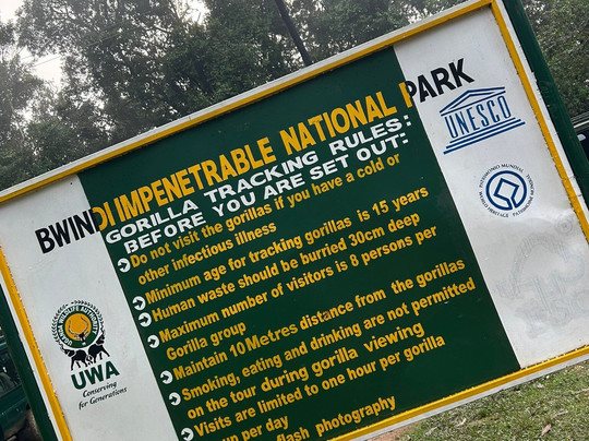 建议多穿几层衣服,因为清晨开始徒步可能会比较冷。我们很庆幸从旅馆借到了绑腿,但我们忘了带口罩和手套,所以请务必带上园艺手套,因为向导会收取每副20000先令的费用,或者收取用过的手套的费用,徒步结束后归还即可。简易口罩也要5000先令。园艺手套非常必要,因为周围有很多荆棘之类的东西。森林非常茂密,所以徒步过程中可能会遇到植被茂密、地形崎岖的情况。戴口罩是为了在靠近大猩猩时保护它们。