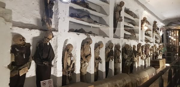 翻译:今天去参观了地下墓穴,看看是否值得 Donna 和 Pam 前来参观,因为要走一段路。这是一次不同寻常的参观,不太可能让人忘记,但你不能拍照。另一个好处是这里不像巴黎,所以如果你有幽闭恐惧症也不用担心。地下墓穴主要由一排排的尸体组成。当游客们试图欣赏他们所看到的东西时,气氛安静而恭敬。最悲伤的部分是婴儿和儿童。我发现看到尸体上 19 世纪的衣服很有趣,虽然已经褪色和积满灰尘,但你还是能看出一些。非常令人失望的是没有导游,也没有关于地下墓穴中尸体的解释,但你可以扫描二维码,了解整个历史。这里并不适合所有人!不要带小孩来这里。另外,在离开之前不要去看看墓地,那是我的亮点。巨大而令人惊叹。这是价值 5 欧元的工作。