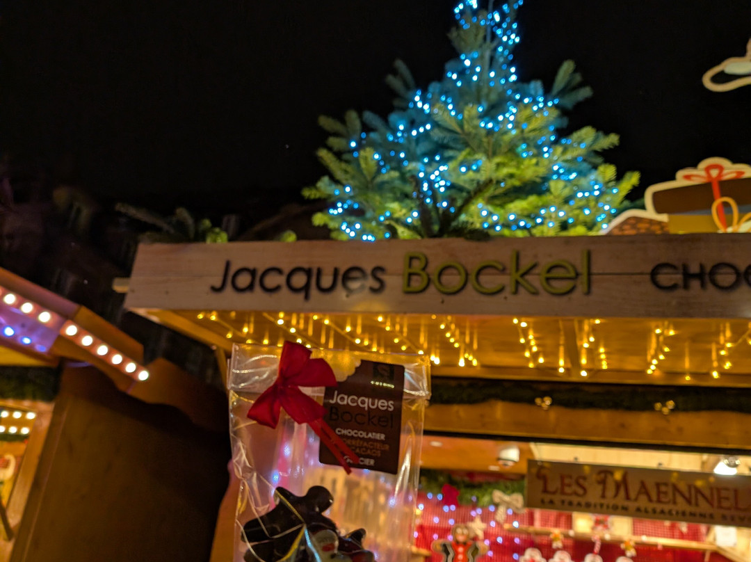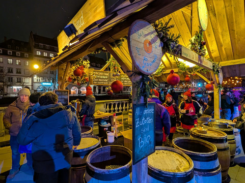 我们在平安夜通过Get Your Guide预订了One City Tours的导览游。导游帮我们理清了各个市场,并带我们找到了每个市场的特色摊位,包括哪里可以买到巧克力、热红酒、鹅肝、烈酒等等。不过,令人惊讶的是,位于布罗格利广场(Place Broglie)的圣诞市场(Christkindelsmärik)虽然历史悠久,却是我们参观过的所有市场中最不吸引人的。