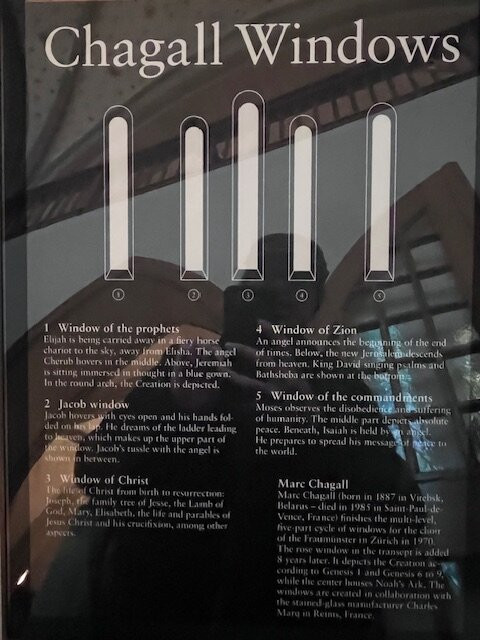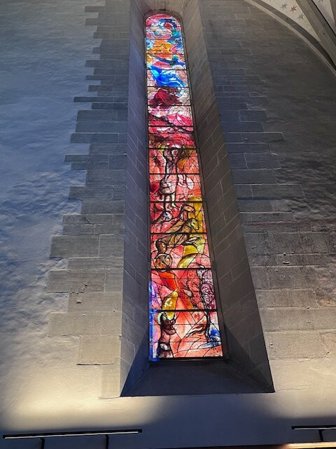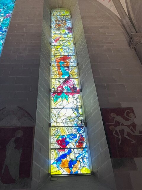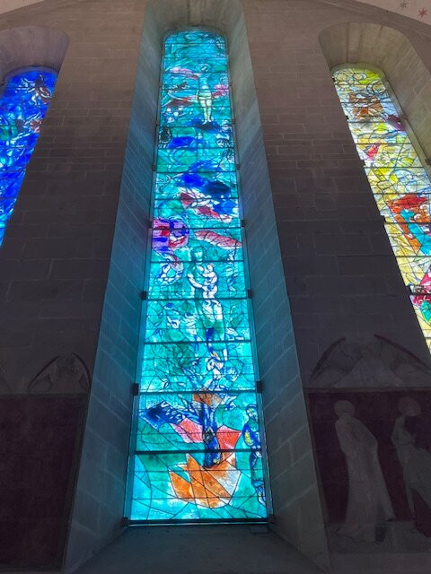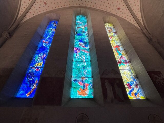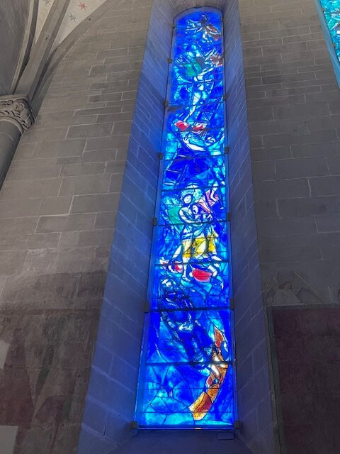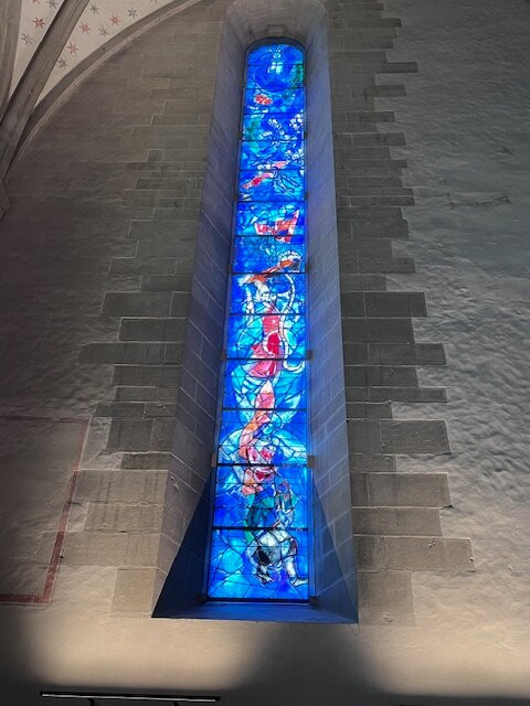 毫无疑问,这里真正的亮点在于夏加尔设计的彩色玻璃窗,它们为整个空间注入了色彩和艺术气息。每一扇窗户都讲述着一个独特的故事,以其美感深深吸引着游客。单凭这些玻璃窗就值得一游,它们与教堂内部其他部分的低调装饰形成了鲜明的对比。