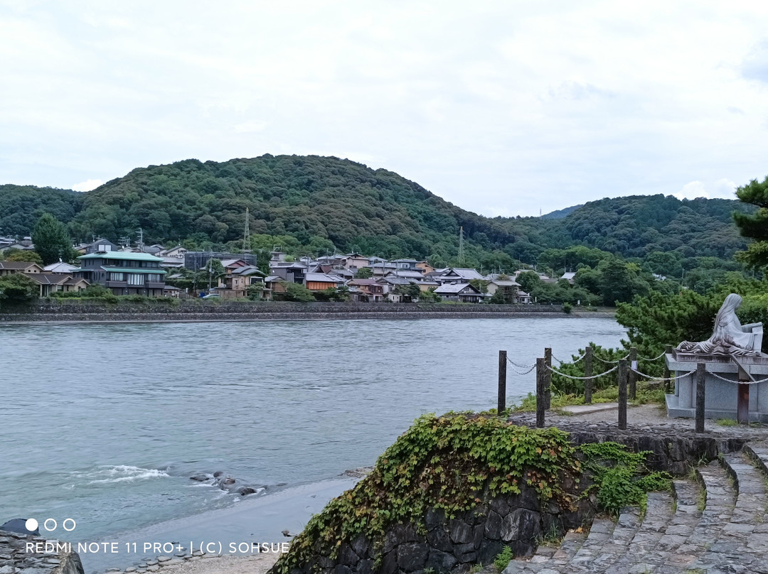 路边有一块牌子,上面写着它是日本最古老的桥梁之一。多年来,它曾多次被摧毁和重建,目前的桥梁于 1996 年完工,其栏杆上有青铜装饰帽,设计旨在与周围景观相协调。宇治还有许多《源氏物语》纪念碑,它们位于不同的位置。