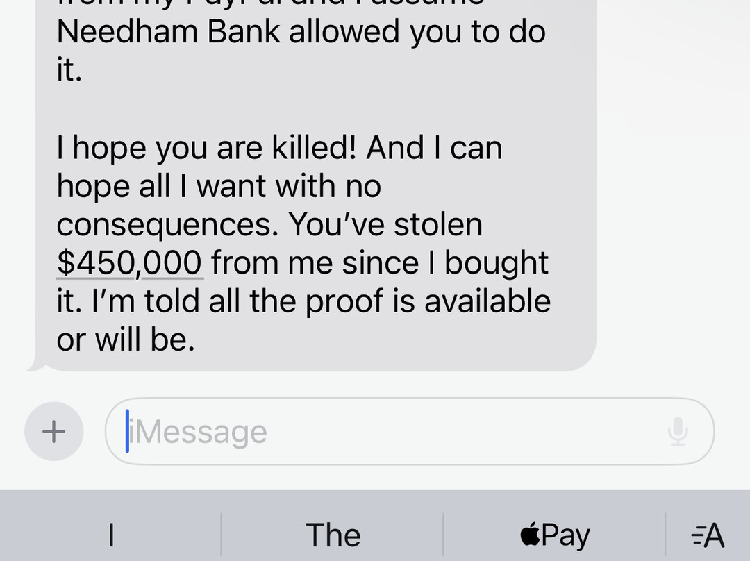 简而言之,业主正处于非常严重的精神健康危机之中,任由她的企业分崩离析,同时诬告前员工和其他人偷窃、暗杀她(而她希望前员工死掉),等等。我附上了她最近发给前老板的短信,作为她精神健康状况下降后,她的前员工(和其他人)遭受的骚扰的一个例子。离她远点。