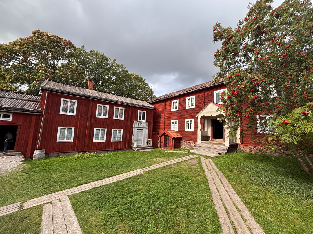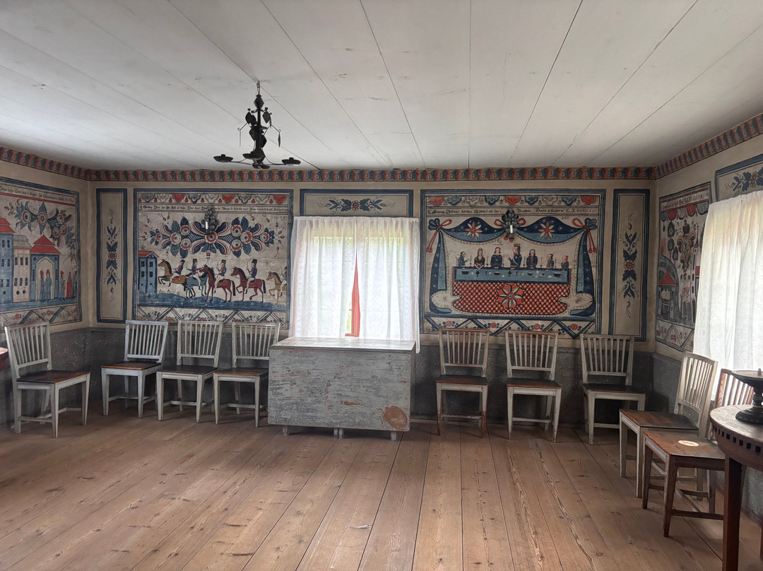 我们弯腰在斯科纳农庄(Skane Farmstead)的屋子里探望,进一步了解了那里典型的农场生活,然后我们来到了德尔斯博农庄(Delsbo Farmstead)。德尔斯博农庄的风格截然相反,它装饰华丽,墙上绘满了细致的壁画,据说这些壁画是由这个富裕家庭的工作人员出资绘制的。