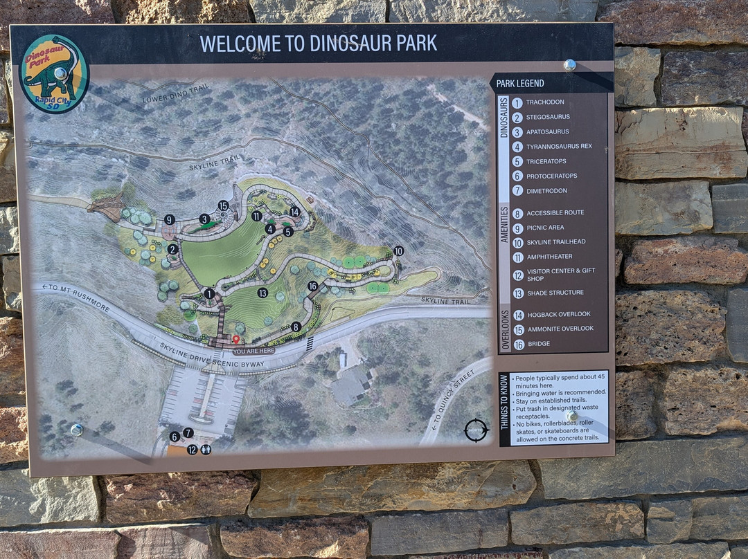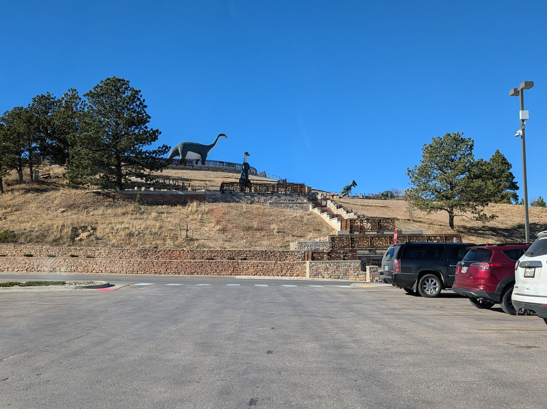 The path is steep if you take the stairs, but this is wheel chair friendly, but you would want someone to push you up the hill. I think it is too steep to wheelchair yourself up the hill. We were there about 2 hours. Got to see some great statues of dinosaurs. Each dino had signage to give you details about the dino and it was interesting to read. The view of Rapid City from on top of that hill was amazing. I wish the VC was open but it was a Sunday and off season. This was free to attend. Kids were climbing on the dinos.