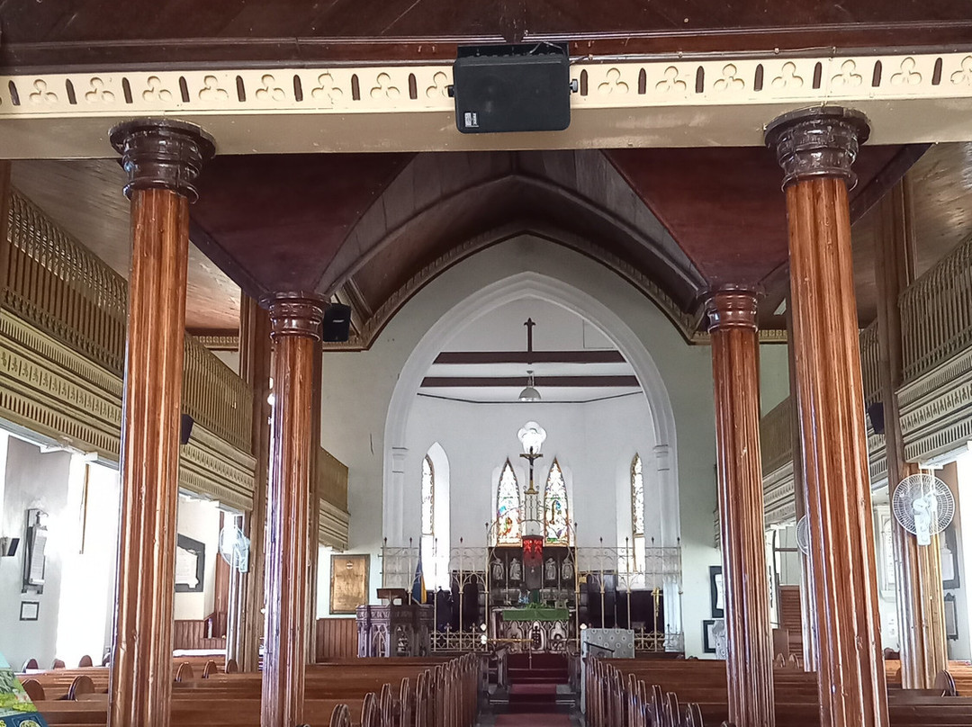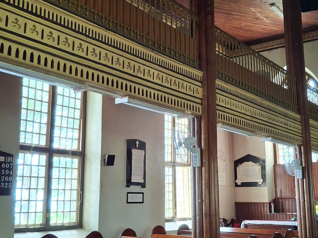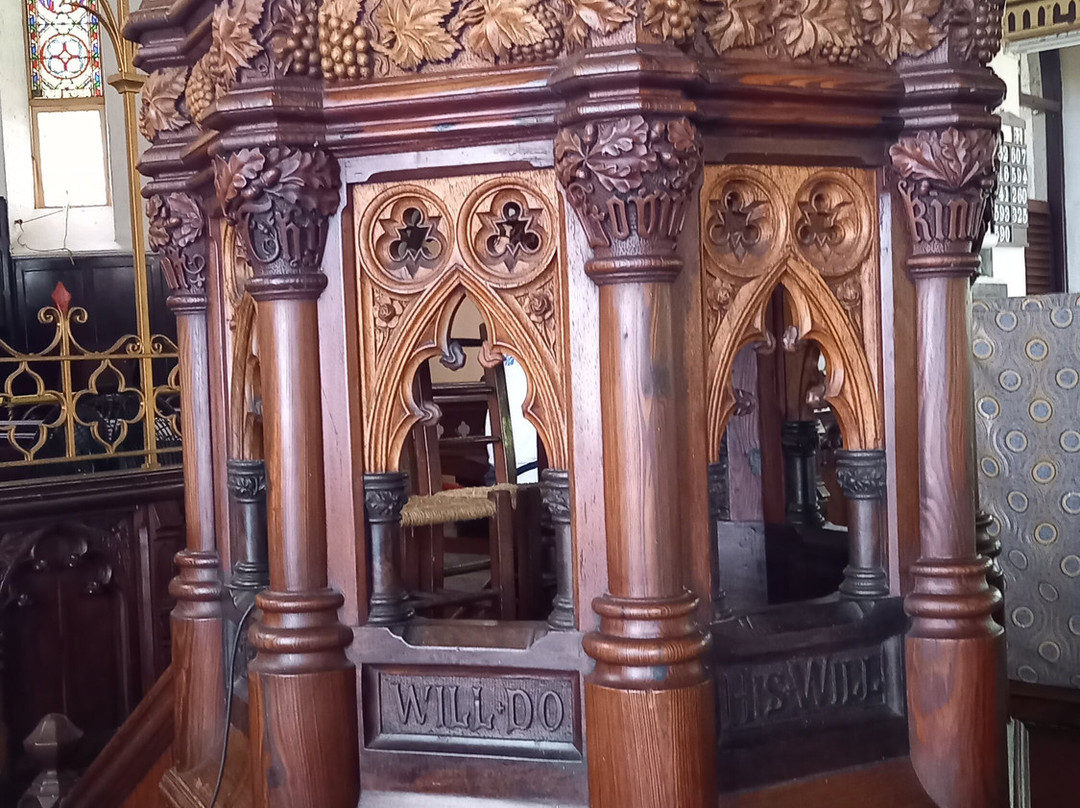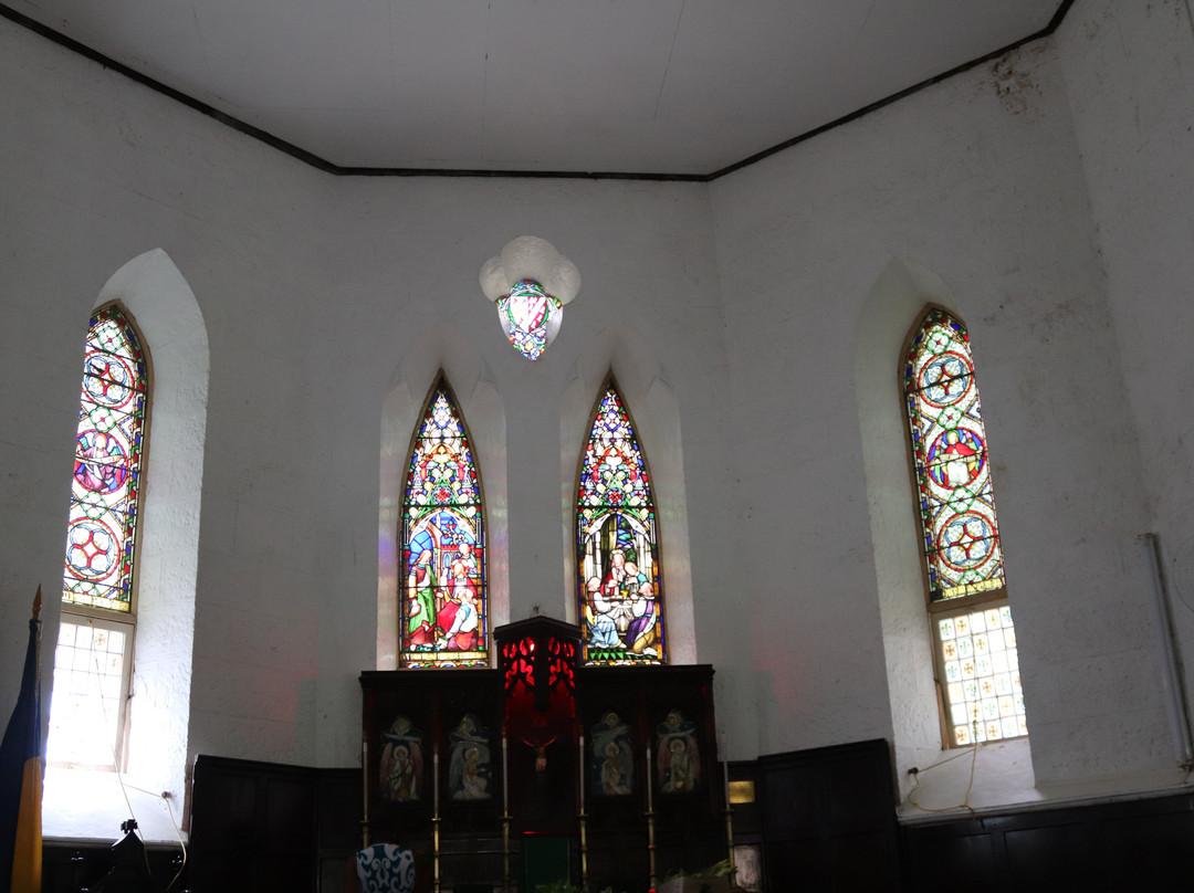 教堂为哥特式风格。教堂内部,我们可以欣赏到美丽的彩色玻璃窗和一个由六种不同木材雕刻而成的讲坛。入口处,两段弯曲的木质楼梯通往上方,那里放置着管风琴。