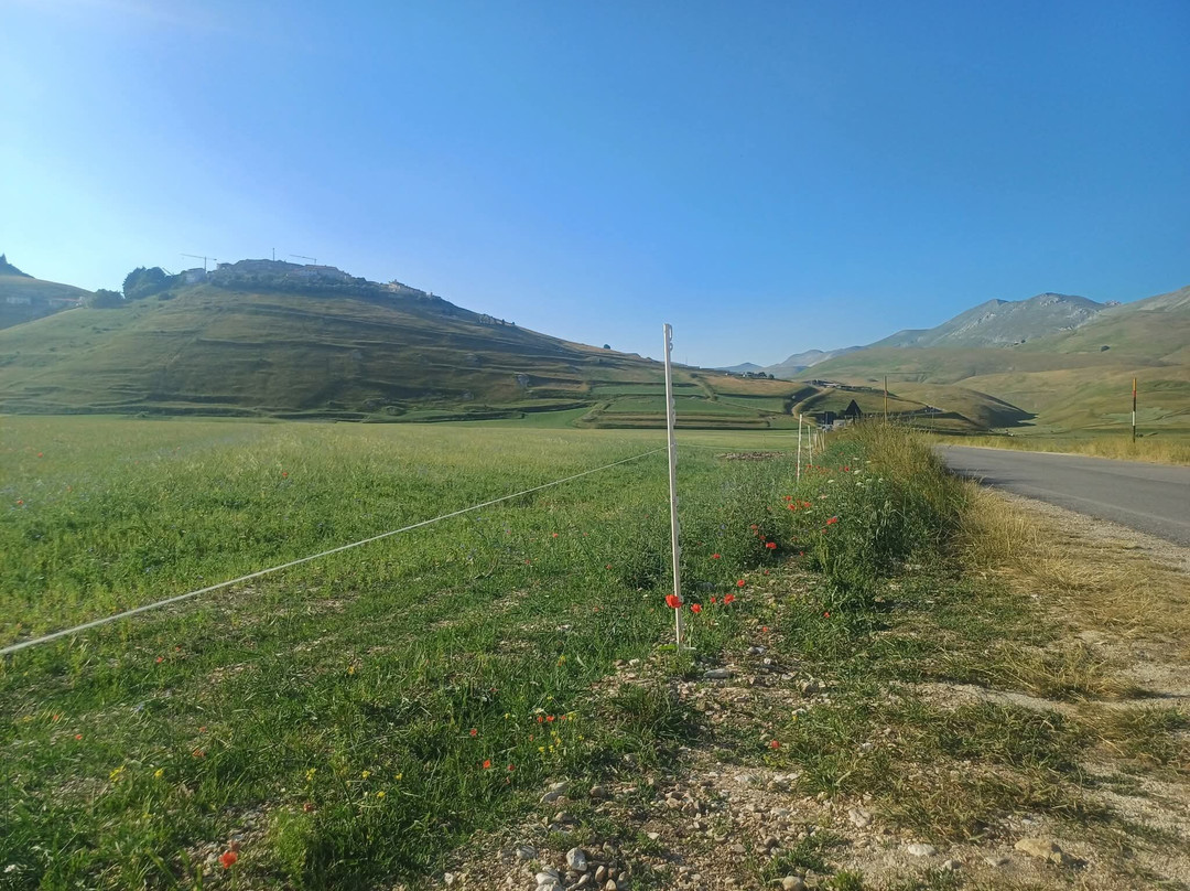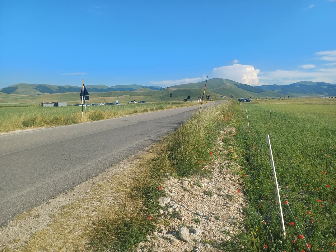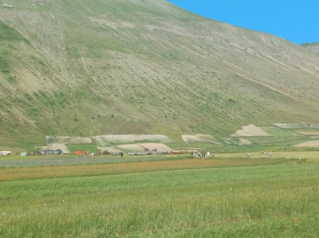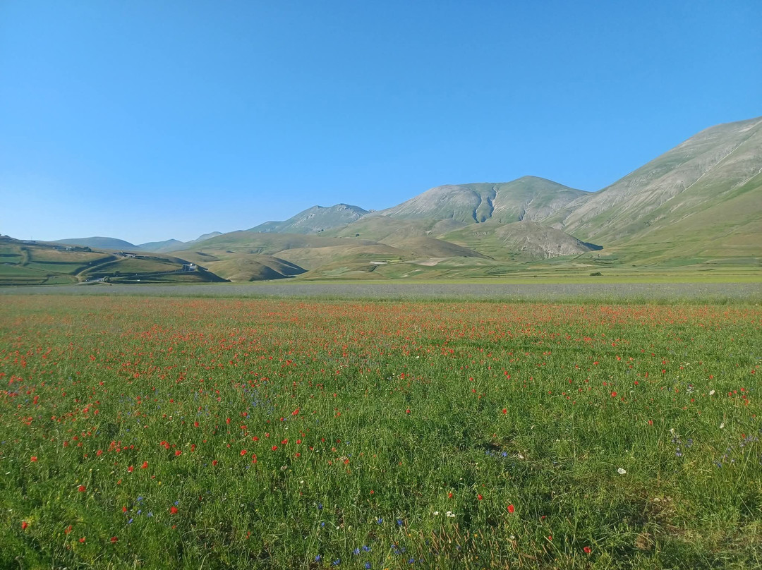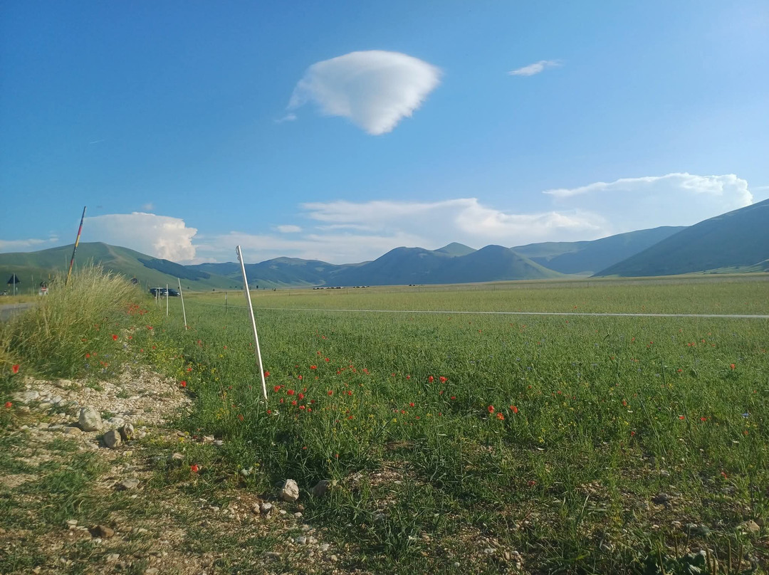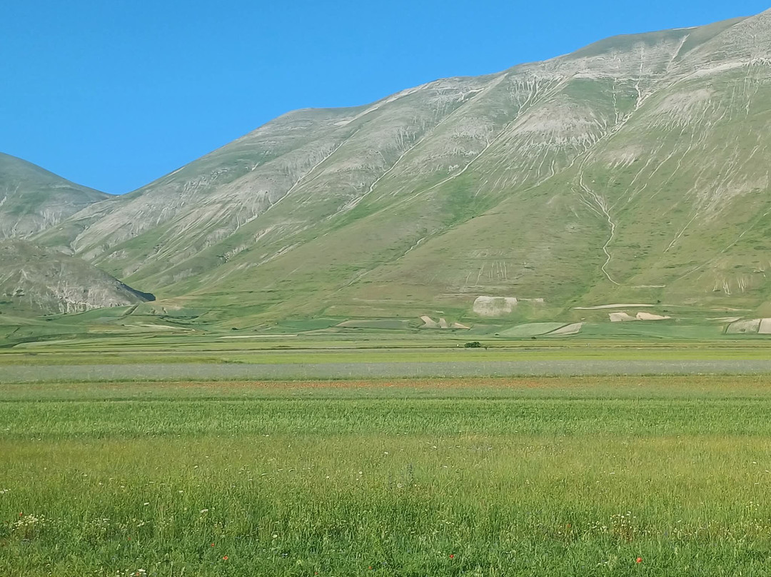 点评:Davvero straordinaria la località dei Piani di Castelluccio di Norcia che, dopo aver sentito nominare a lungo, finalmente sono riuscito a visitare il mese scorso in compagnia del mio insostituibile Cicerone 🧔🏻 (a proposito, un ringraziamento a lui per l'ottima organizzazione del viaggio). Giunti a Castelluccio sulle 17.30 🕠, ci siamo dapprima concessi un caffè ☕️ presso uno dei locali in corrispondenza del passo, salendo poi in auto 🛻 lungo il sentiero sterrato sul costo del monte che domina la piana sottostante. Favoloso il colpo d'occhio 👁 apprezzabile da qui, proprio come mi era stato raccontato, ancorché della famosa fioritura 🌺🌼 quasi non vi fosse traccia. Molto verde 🌱 (questo sì), ben visibili e coreograficamente di grande impatto i vari appezzamenti di forma quadra e rettangolare (questo pure), ma di fatto pochi fiori 🌺🌼 (si notava solo una quasi impercettibile venatura rossastra ai piedi del pendio). Non che ciò abbia inficiato la bellezza del posto, beninteso, tuttavia non posso negare di essere rimasto comunque un po' deluso. Scendendo lungo la Strada Provinciale 477 che attraversa la piana è andata un po' meglio, visto che dalla stessa alcune infiorescenze risultavano maggiormente visibili; siamo quindi scesi per fare due passi 🚶🏻♂️🚶🏻 e scattare qualche altra foto 📸, riprendendo 🛻 poi il nostro itinerario. Spero di poter tornare presto, anche per visitare il borgo di Castelluccio, sperando in una fioritura dai colori più vivaci. Ad ogni modo, esperienza senz'altro CONSIGLIATA 👍🏻.