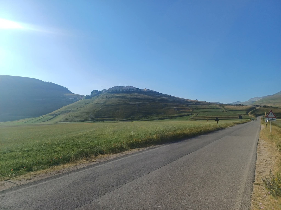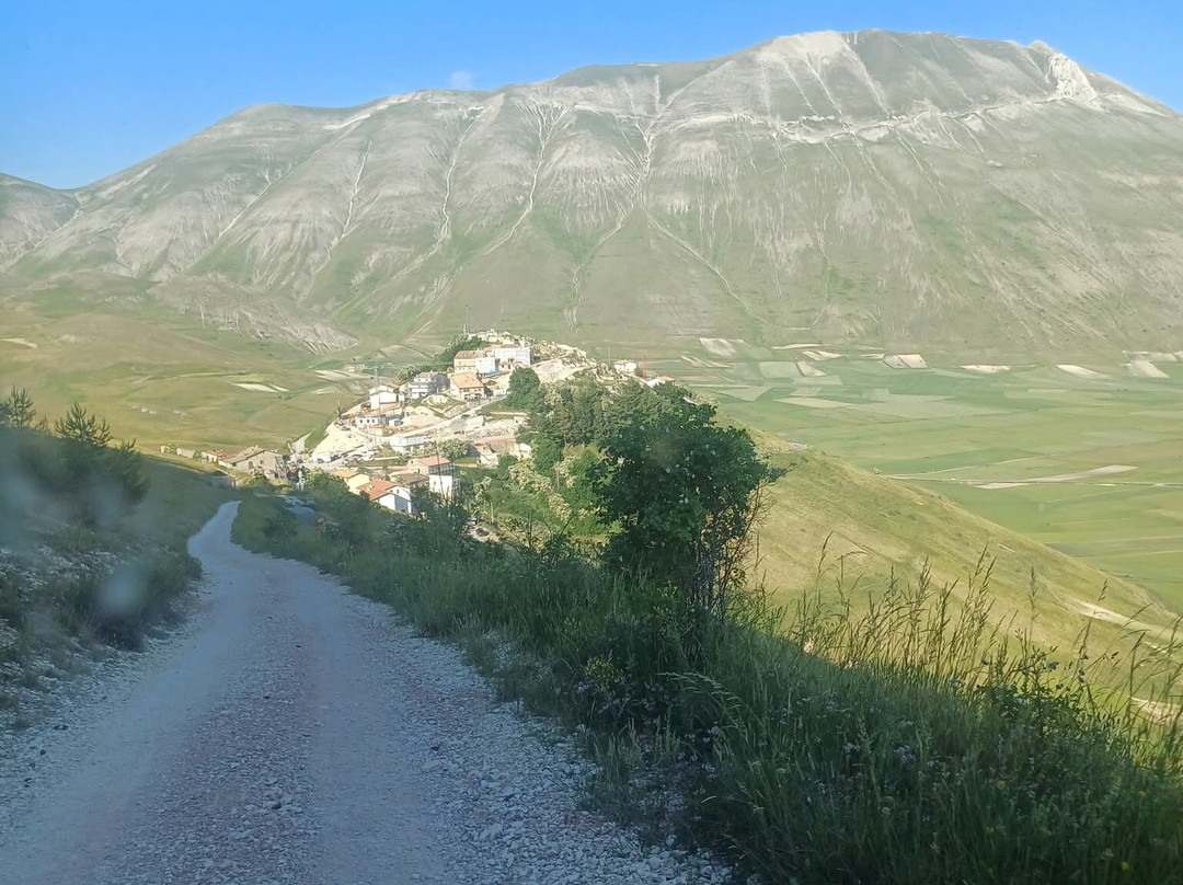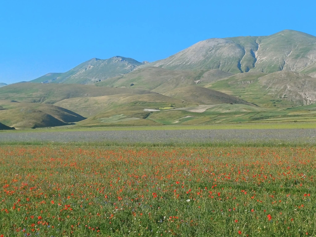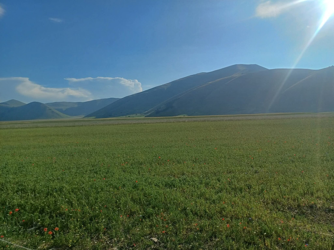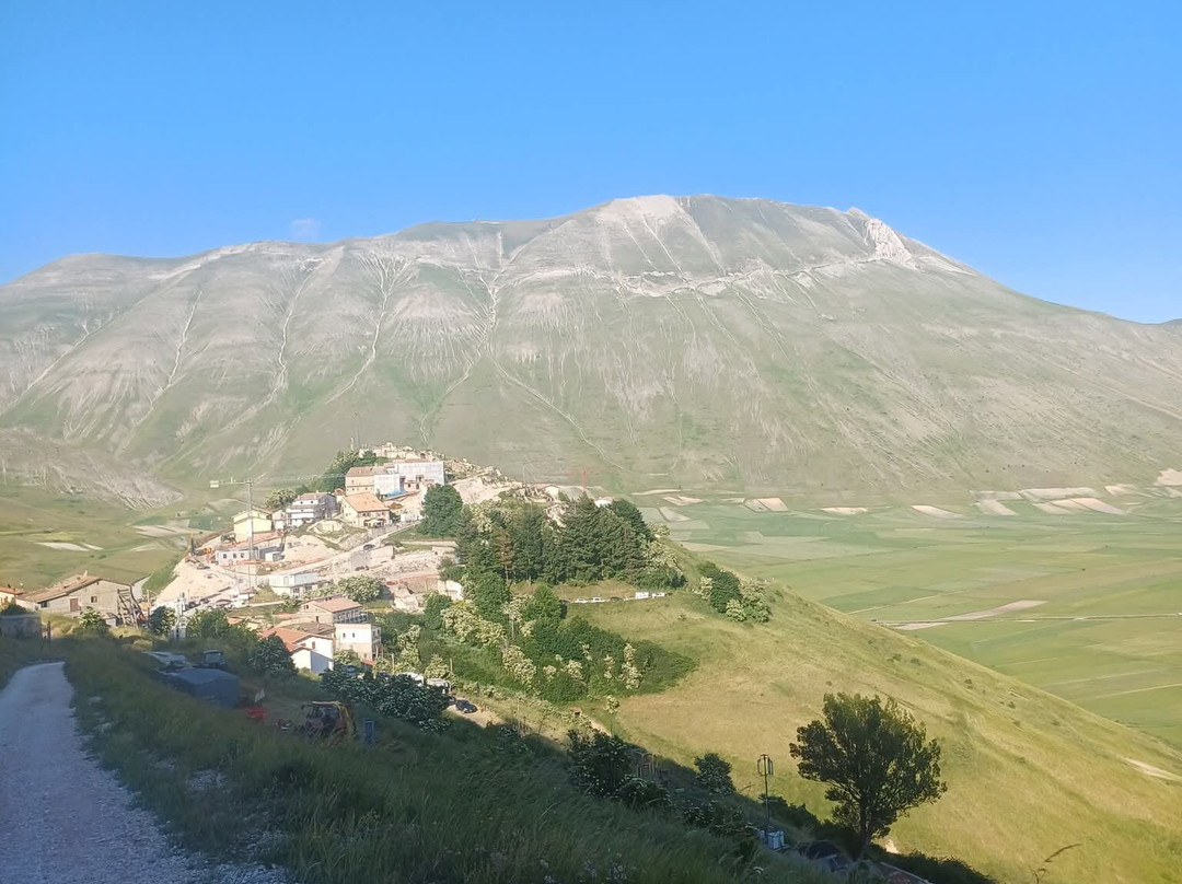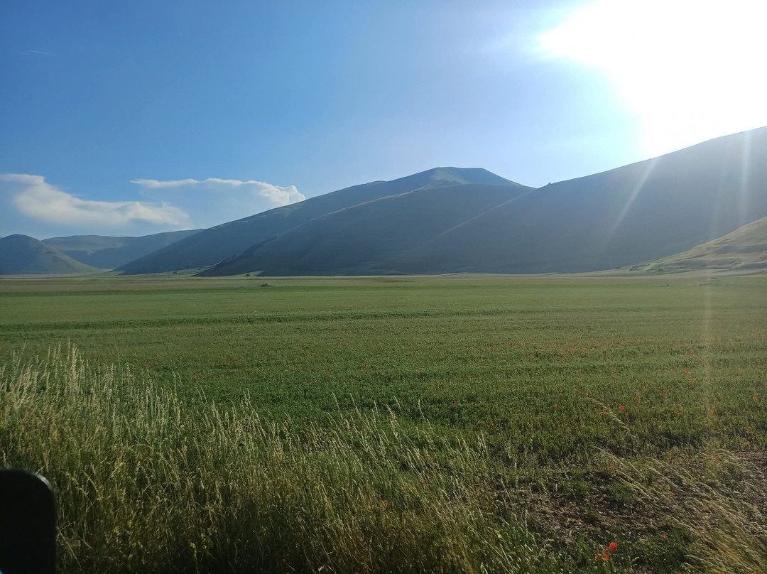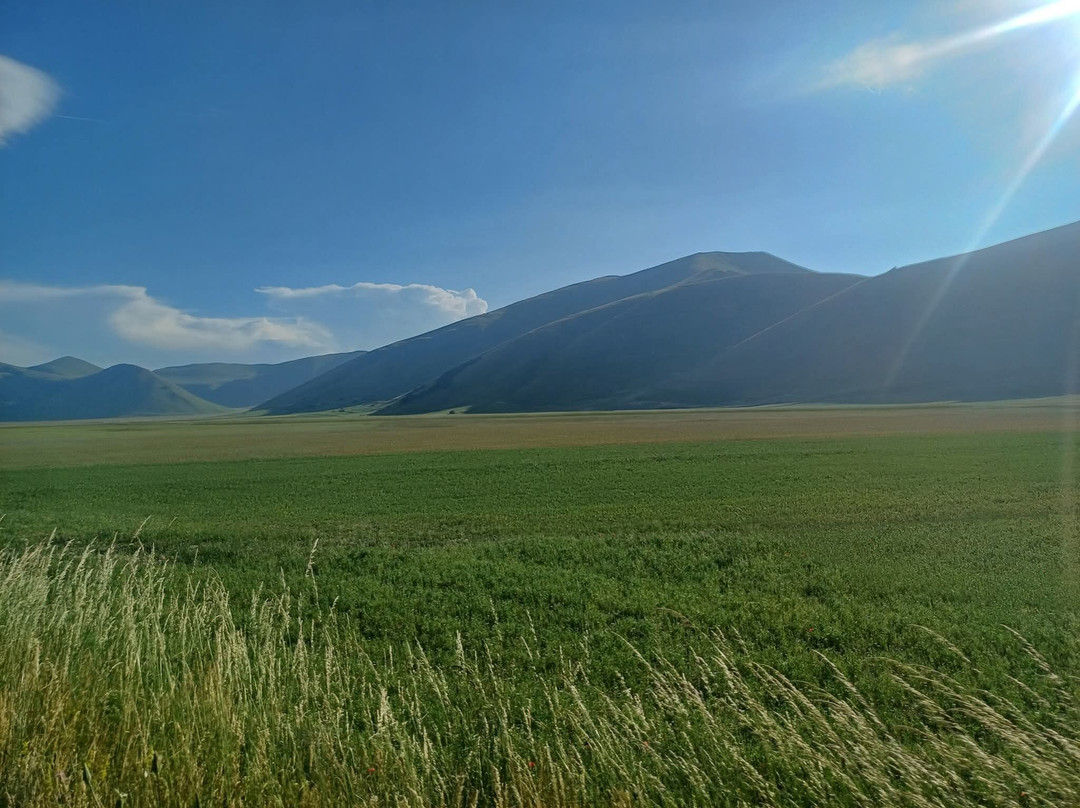 点评:Davvero straordinaria la località dei Piani di Castelluccio di Norcia che, dopo aver sentito nominare a lungo, finalmente sono riuscito a visitare il mese scorso in compagnia del mio insostituibile Cicerone 🧔🏻 (a proposito, un ringraziamento a lui per l'ottima organizzazione del viaggio). Giunti a Castelluccio sulle 17.30 🕠, ci siamo dapprima concessi un caffè ☕️ presso uno dei locali in corrispondenza del passo, salendo poi in auto 🛻 lungo il sentiero sterrato sul costo del monte che domina la piana sottostante. Favoloso il colpo d'occhio 👁 apprezzabile da qui, proprio come mi era stato raccontato, ancorché della famosa fioritura 🌺🌼 quasi non vi fosse traccia. Molto verde 🌱 (questo sì), ben visibili e coreograficamente di grande impatto i vari appezzamenti di forma quadra e rettangolare (questo pure), ma di fatto pochi fiori 🌺🌼 (si notava solo una quasi impercettibile venatura rossastra ai piedi del pendio). Non che ciò abbia inficiato la bellezza del posto, beninteso, tuttavia non posso negare di essere rimasto comunque un po' deluso. Scendendo lungo la Strada Provinciale 477 che attraversa la piana è andata un po' meglio, visto che dalla stessa alcune infiorescenze risultavano maggiormente visibili; siamo quindi scesi per fare due passi 🚶🏻♂️🚶🏻 e scattare qualche altra foto 📸, riprendendo 🛻 poi il nostro itinerario. Spero di poter tornare presto, anche per visitare il borgo di Castelluccio, sperando in una fioritura dai colori più vivaci. Ad ogni modo, esperienza senz'altro CONSIGLIATA 👍🏻.