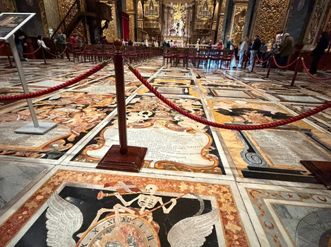 翻译:我发现,无论你信仰什么,甚至什么都不信,都值得去世界各地的宗教场所参观——这里就是其中之一!两个人只需大约35美元,就能漫步在这座充满精美艺术品的教堂里——它几乎不像是一个宗教场所,更像是一座美术馆 :) 我说的还不是卡拉瓦乔的独立展厅和楼上,而是教堂的主区域,令人叹为观止——我最喜欢的是……地板!
