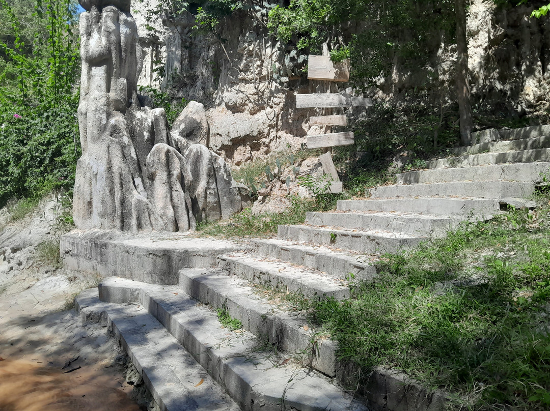 The plant life eventually gives way to impressive limestone formations embedded in the red clay cliffs. These are impressive to see up close and above ground. There is a large cluster of stalagmites that look like small statues that have been weathered over the years.