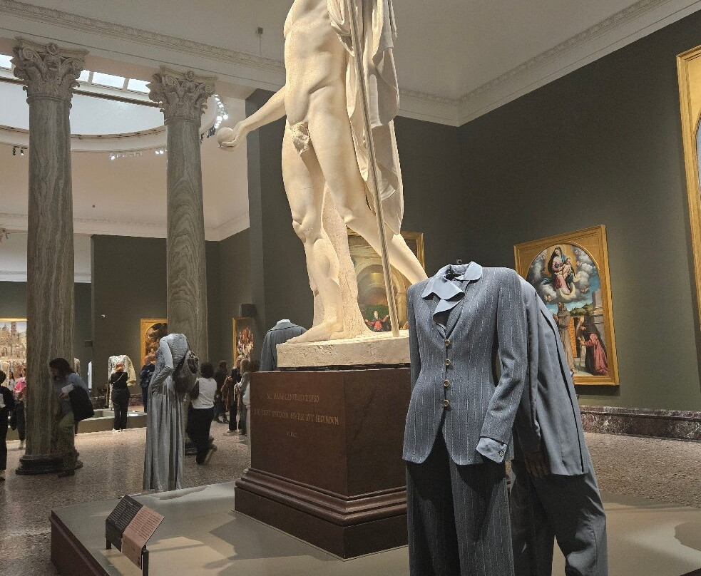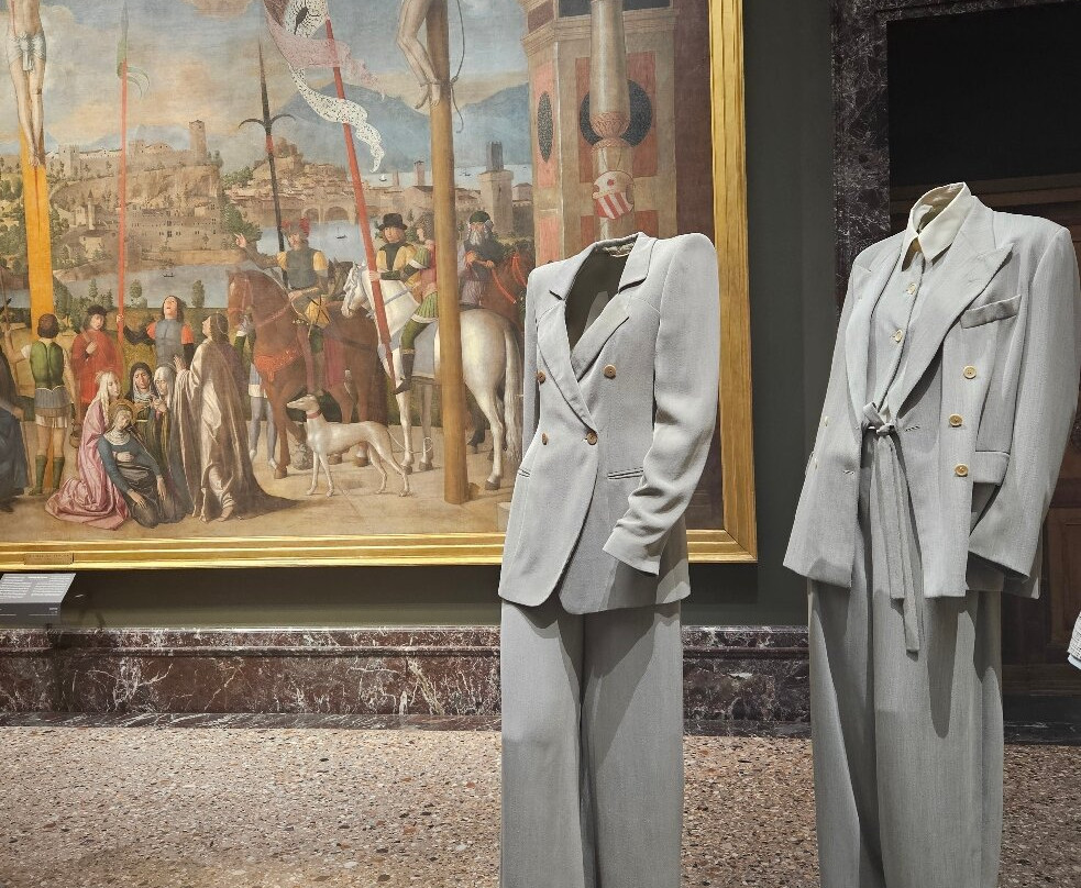 翻译:惭愧地承认,我从未参观过布雷拉美术馆,直到乔治·阿玛尼的大型展览才让我真正领略了这座无价之宝的魅力。展览的展厅收藏了从中世纪到十九世纪的绘画作品(几乎全部是宗教艺术),其中包括曼特尼亚、卡拉瓦乔、拉斐尔、丁托列托和海耶兹等人的作品。因此,它提供了一个机会,可以欣赏到丰富的绝对杰作,其中一些非常著名(我只提其中一幅:拉斐尔的《圣母的婚礼》,这是我的最爱之一),同时欣赏这位塑造了意大利时尚界最重要的设计师的礼服,这些礼服本身就是杰作。显然,作品和礼服之间没有任何关联,我想有些人可能会觉得将宗教艺术与时尚并置是不恰当的,甚至是“亵渎神明的”。然而,我发现它简直太棒了,只有一个缺点……你会发现自己被如此丰富的美景包围,以至于你的眼睛都不知道该往哪儿看了!