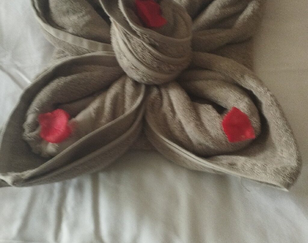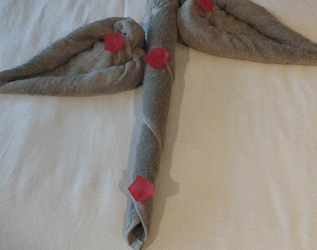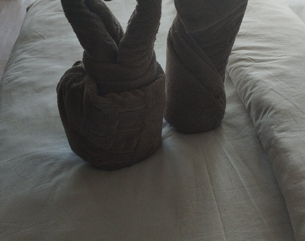 但最让我们印象深刻的是负责我们房间清洁的女佣的创意。她每天都用我们房间的毛巾在床上创作出一件真正的艺术品。一切都维护得一丝不苟。她甚至在我们没要求的情况下,就主动帮我们清洗了沾满沙子的凉鞋。非常感谢Khaddy Jammeh。