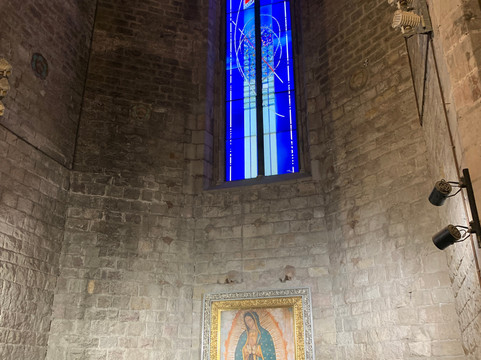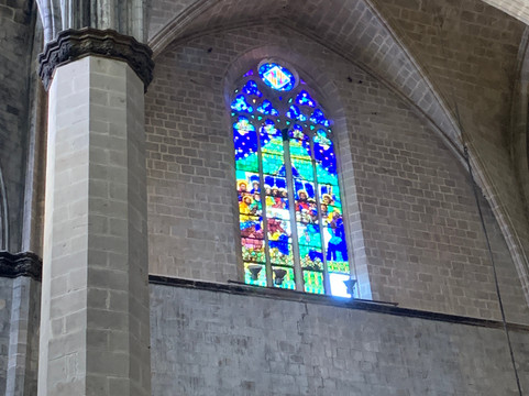 Nelle vetrate noterete spesso lo scudetto del FC Barcellona, perché la società calcistica contribuì negli anni ’60 alla ricostruzione della chiesa dopo i danni della guerra civile spagnola.