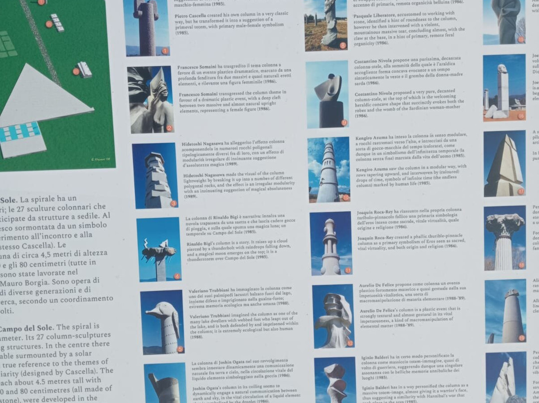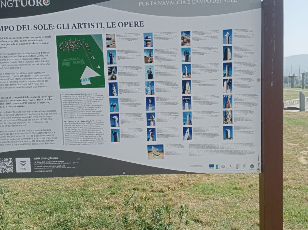 点评:Campo del sole è un imponente insieme architettonico, un museo all’aperto, un parco musivo, unico nel suo genere, che sorge a Punta Navaccia, progetto ideato dal noto artista Pietro Cascella con la collaborazione dello scultore Mauro Berrettini e della scultrice svizzera Cordelia von den Steinen. L'opera nel suo completo è formato da 27 colonne-sculture. Vi sono opere di Wei Tu , Pietro Cascella, Francesco Somaini, Hidetoshi Nagasawa, Rinaldo Bigi , Valerio Trubbiani, Joshin Ogata, Adolfo Innocenti , Pasquale Liberatore, Costantino Nivola, Kengiro Azuma, Joaquìn Roca Rey, Aurelio De Felice, Iginio Balderi, Giò Pomodoro, Anselmo Giardini, Joe Tilson