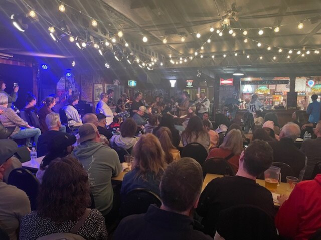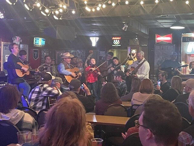 翻译:首先,我们参加了周日晚上 7 点举行的免费蓝草音乐即兴演奏会,谁来演奏谁就演奏。很明显,这里有些常客,也有些常客不认识的临时客人。他们互相试探,然后开始演奏。这太有趣了。我们玩得很开心。这就像有 150 个你最喜欢的朋友,其中 20 个带着乐器,在你的客厅里待了几个小时。这个地方并不花哨,也不假装花哨。人们都超级友好,人群多种多样,座位很紧凑。“酒吧”提供啤酒和苏打水,以及不含酒精的饮料,绝不提供葡萄酒或烈酒。还有披萨、热狗和爆米花供购买。这个地方很有家庭的感觉。一位常客,在我的一张照片中戴着牛仔帽,是 Grand Ole Opry 广场舞者。我希望我能记住他的名字。他是当晚的主持人,非常有趣。音乐很棒!才华横溢!