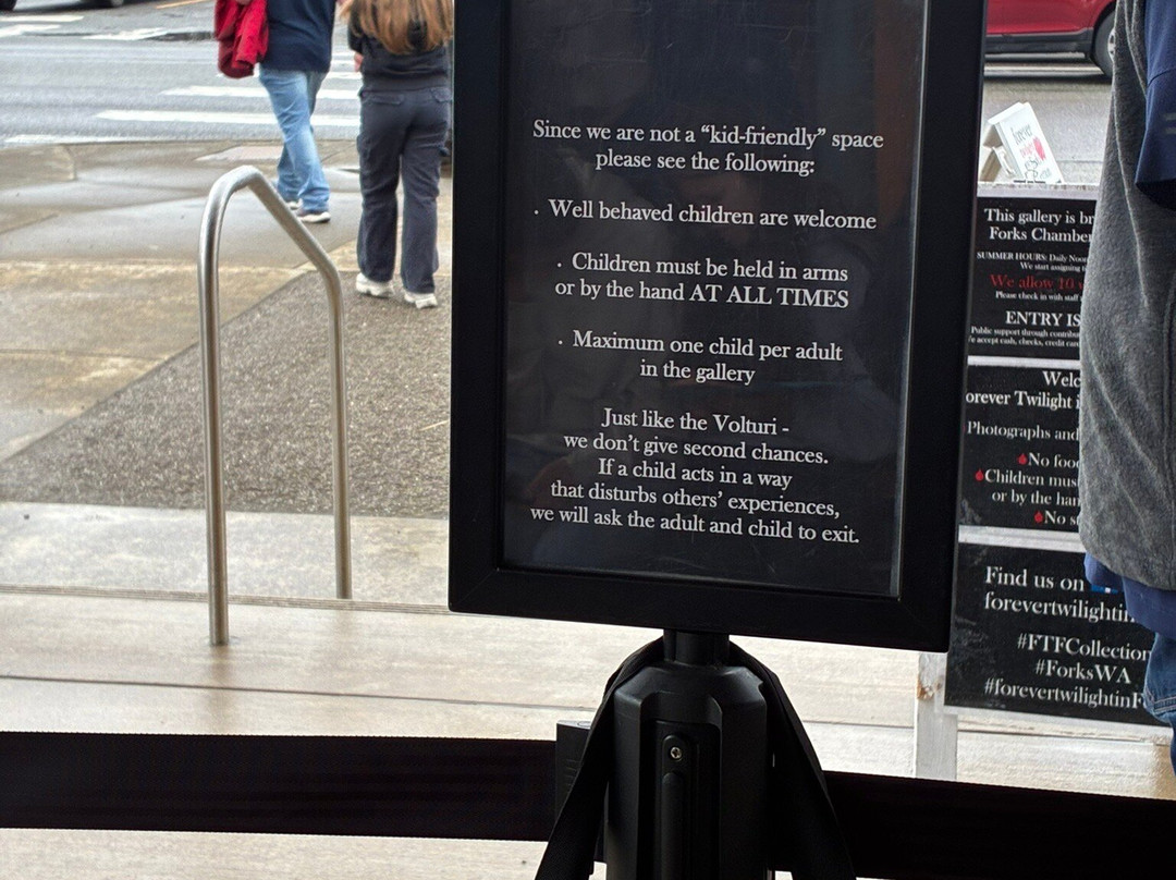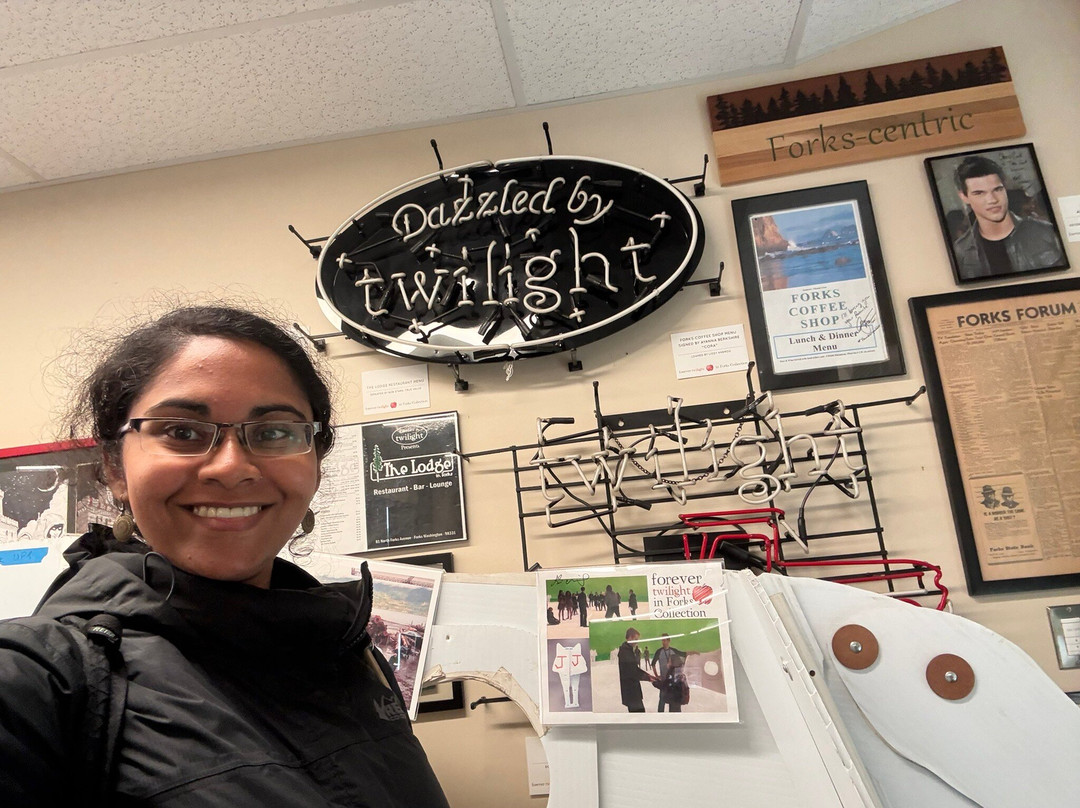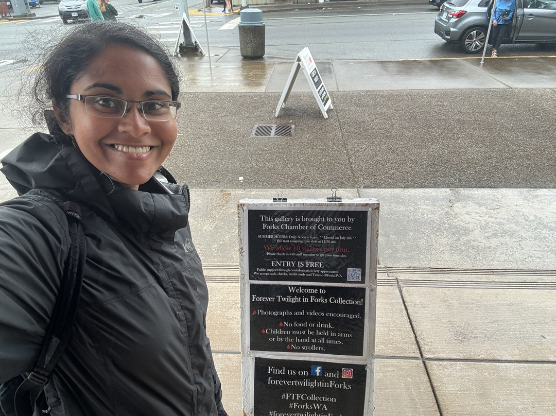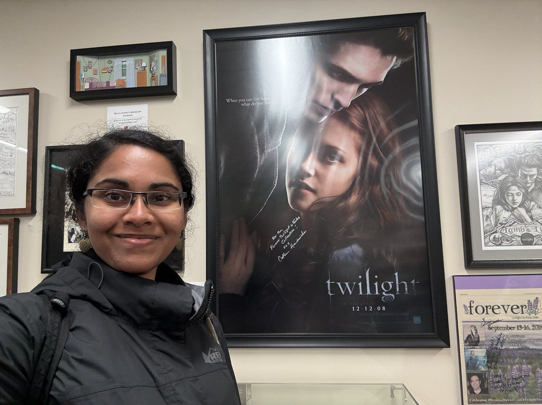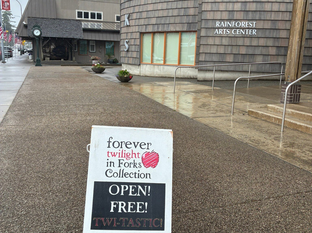 点评:I visited Forever twilight in forks collection which was right across the street from Native to Twilight! It is free to enter the place and check out props from the twilight movies. However you have to sign up in the register by writing your name there. You’ll be given a time slot and you have to wait in line to enter. A set of people are usually allowed inside for a fixed duration of time where you can go around the room and explore the props. There will be a short orientation of sorts where the staff explain what to expect and talk about trivia related to the twilight movies. These tours happen once every 20 minutes or so. I went there and got my name for one of the afternoon slots. They do not have restrooms and the staff suggested going to the public library which was close by to use the restroom or get some drinking water. I was able to go there, spend time in the library, and come back in time for my tour. Once you’re inside, you get about 15 minutes to check out the props from the movies and take lots of photos! I loved the experience - it was so much fun! I would definitely come back here ❤️