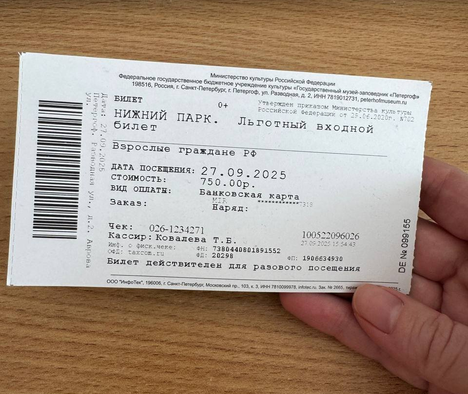 点评:27 сентября я вместе с отцом посетила Петергоф. Впечатление от посещения, к сожалению, было испорчено с самого начала — на кассе Нижнего парка мы столкнулись с крайне грубым и раздраженным поведением сотрудницы кассы (Ковалева Т.Б.).