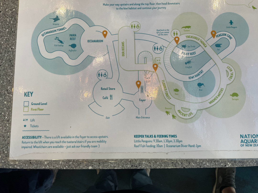水族馆里有一个海洋馆和一个海洋馆隧道,可以看到鳐鱼和喂鱼表演。还有三个珊瑚礁展区,里面有河豚、海龟和小龙虾。“我们的海洋”展区展示了新西兰周边海域的各种海洋,此外还有一个模拟淹没森林的展区,里面有食人鲳鱼,还有一个关于恐龙的远古生物展区。我们在温暖水域展区看到了龟,那里也有一些热带鱼。我们还有机会看到了楔齿蜥(之前在其他地方看到过,但都没看到),以及生活在自然栖息地的奇异鸟。