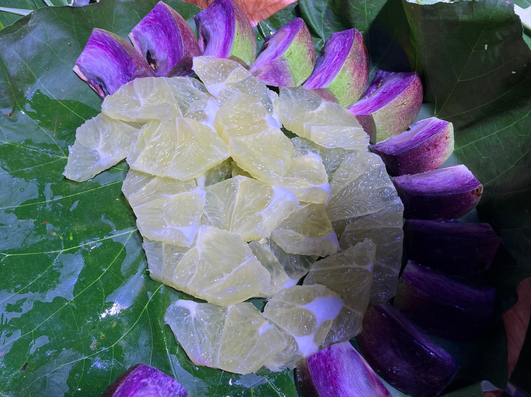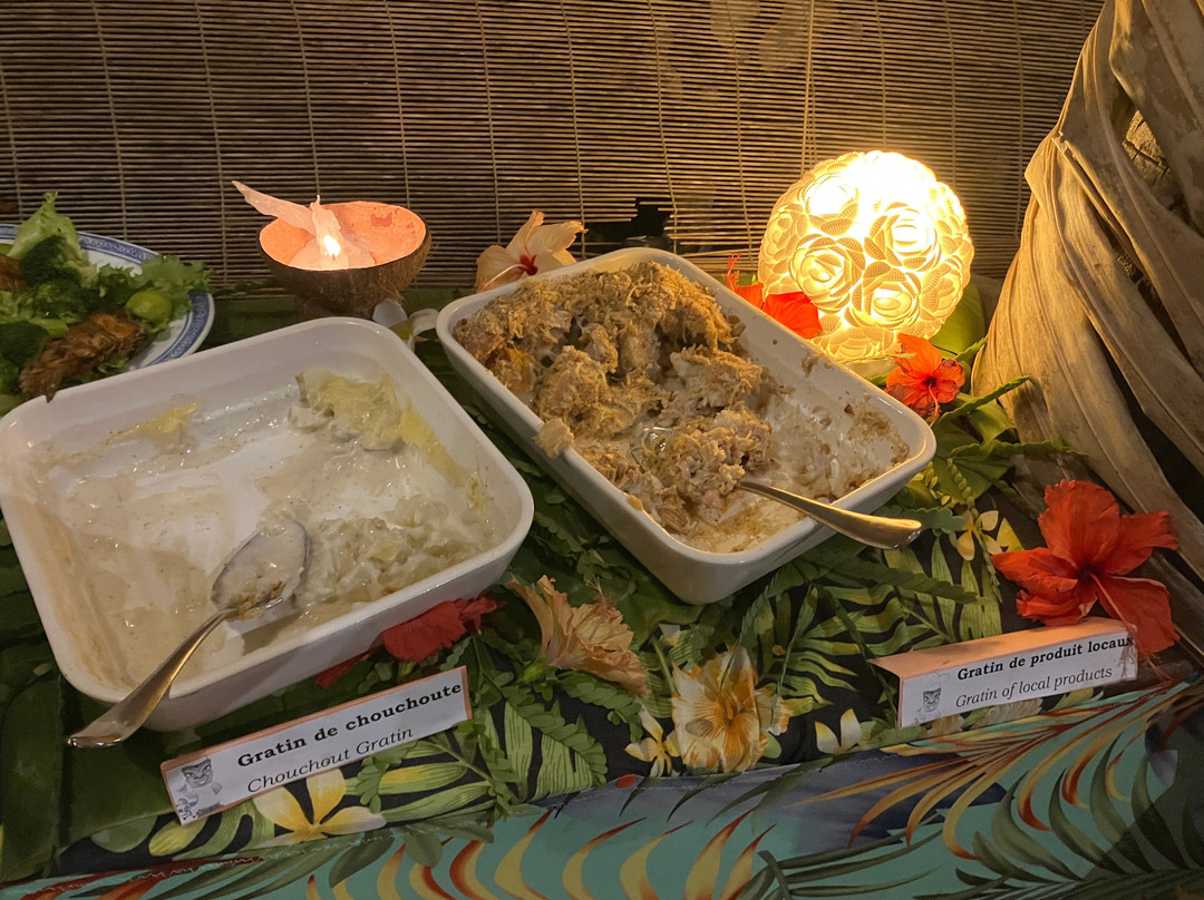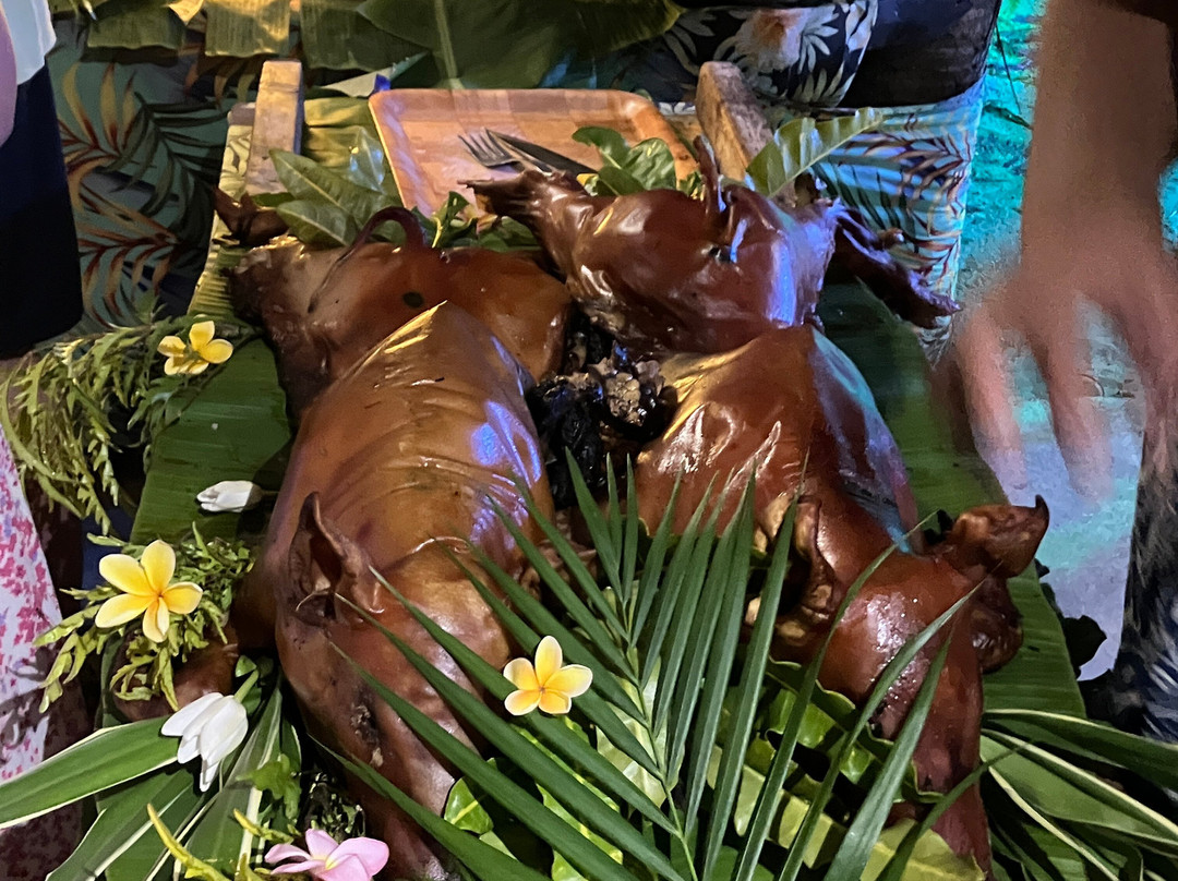 整个体验非常棒。没错,这很像旅游观光,但绝对是最佳选择,我们绝对不会错过。抵达后,我们享用了饮料,并参观了一些展览,包括保罗·高更故居复制品中的版画。之后,我们参观了一个典型的波利尼西亚式大型地下烤炉,并看到了如何建造和层层堆叠食物。之后,我们打开烤炉,看到了已经烘烤了几个小时的食物。