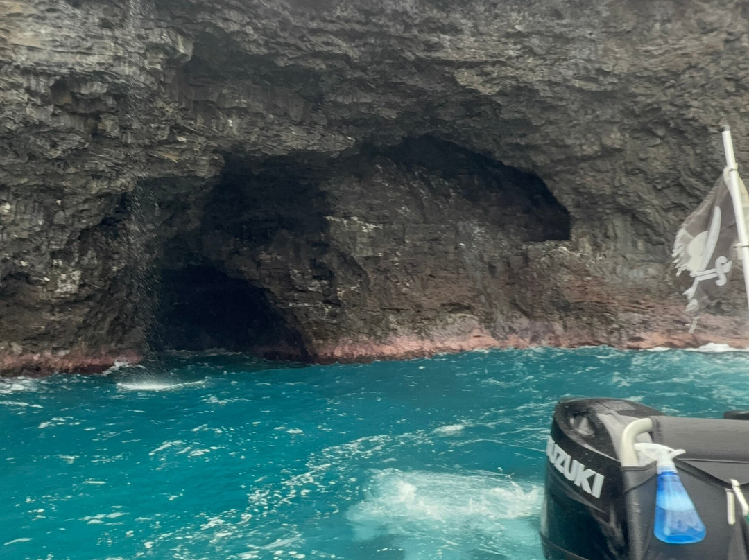翻译:如果你想体验纳帕利海岸的终极魅力,那就来这里吧!Corbin 和 Chaz 带领的纳帕利海盗船队,绝对为你带来了我人生中最难忘的冒险之一。5 小时的橡皮艇之旅令人兴奋不已,我们沿着约 50 英里的壮丽海岸线航行,探索了海蚀洞、隐秘海滩,以及照片都无法完全展现的绝美景色。