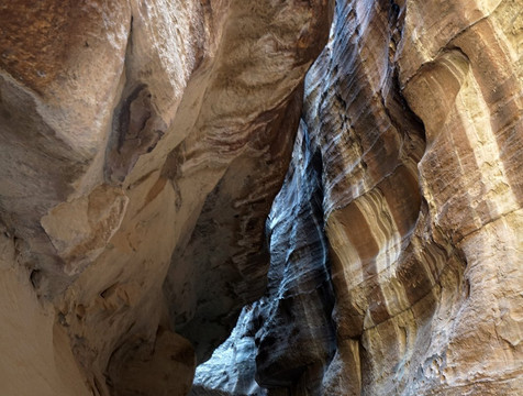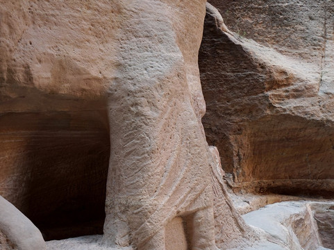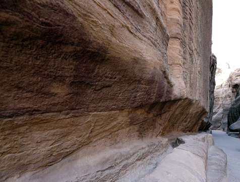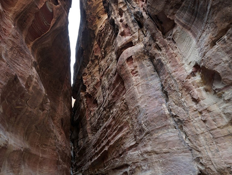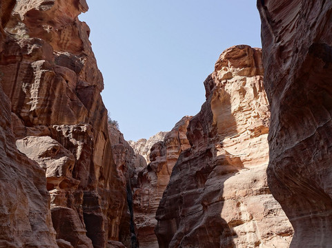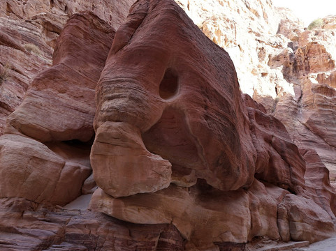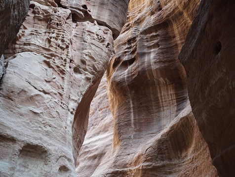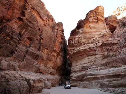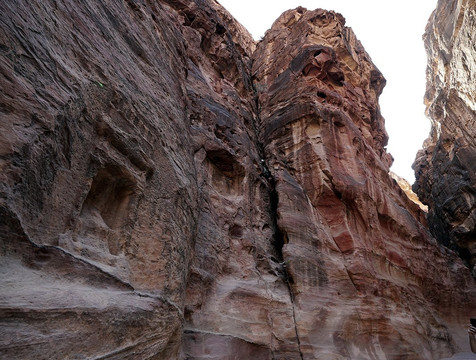 Non abbiate fretta di percorrere lo stretto passaggio: fermatevi ad ammirare le canalette che furono scavate nelle pareti per convogliare l'acqua piovana, le numerose incisioni scolpite, ma soprattutto lo spettacolo delle rocce a volte dalle forme strane e delle alte pareti che si alzano da entrambi i lati e che in alcuni punti arrivano quasi a toccarsi. Un paesaggio unico che si percorre a bocca aperta e che poi, improvvisamente, si restringe in due buie pareti con alla fine, di fronte, la celeberrima immagine di una sottile striscia del Tesoro illuminata dal sole: vista bellissima ma che mi sono trovato davanti quasi con un po' di delusione perchè il Siq era finito.