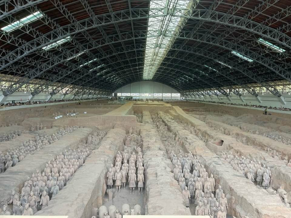 翻译:不容错过的世界标志性考古遗址之一:参观西安兵马俑宝藏——数百尊兵马俑、官兵俑、战马俑、战车俑等。兵马俑建筑群主要由三座大型建筑组成。第一座规模最大,容纳了绝大多数兵马俑,这些兵马俑排列整齐,位于当年发掘的坑中。第一座建筑保存了最完好的遗骸。另外两座建筑中则包含更多兵马俑,尤其是动物和战车俑。兵马俑是西安的热门景点,参观者络绎不绝。有时,你会犹豫是否应该从第一座建筑开始参观,而不是最后一座。这样参观的人会更少一些。我认为,语音导览或请一位考古学家至少对你认为必要的奇观进行简要的讲解是必要的。