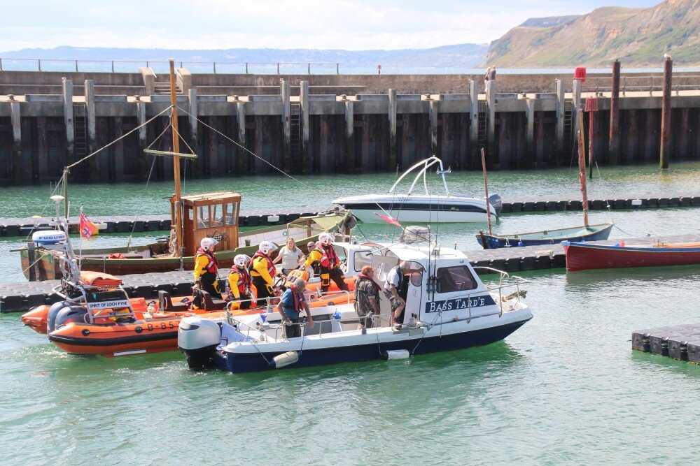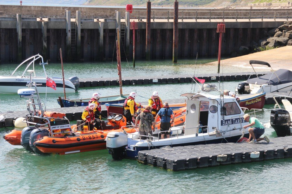 Several children and adults enjoy catching crabs over the harbour wall.