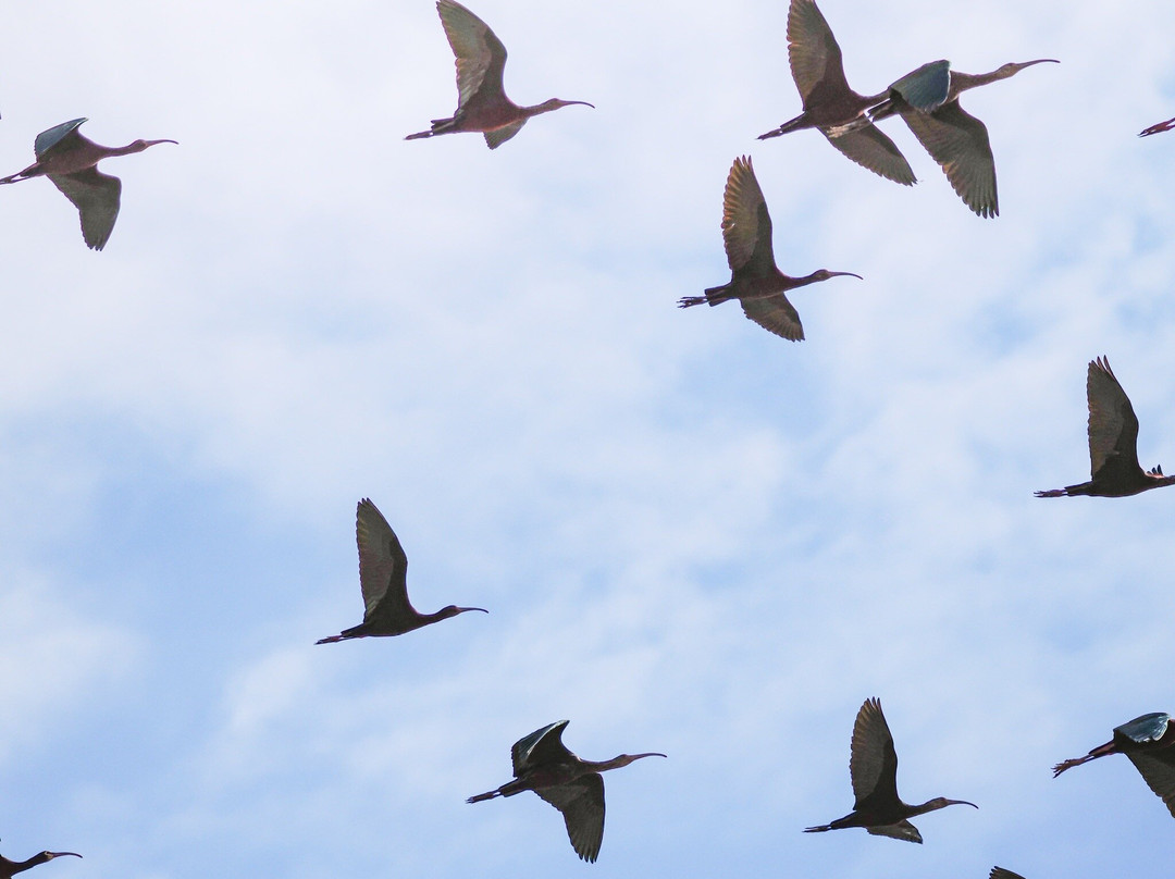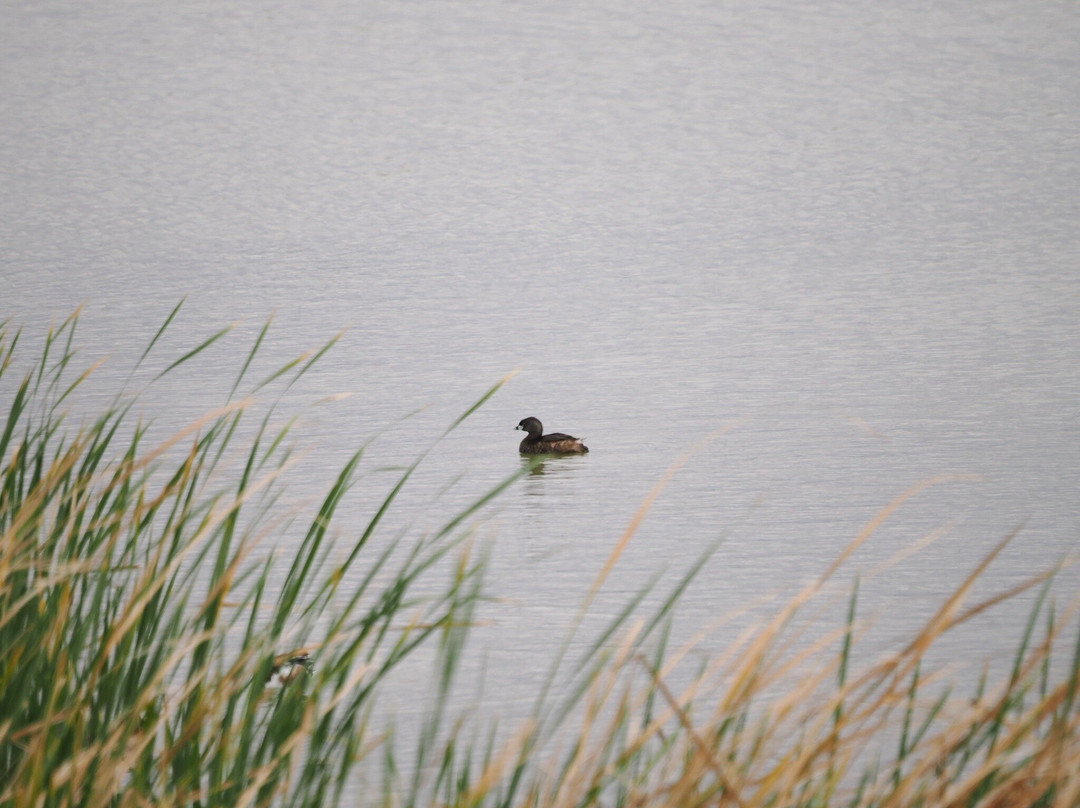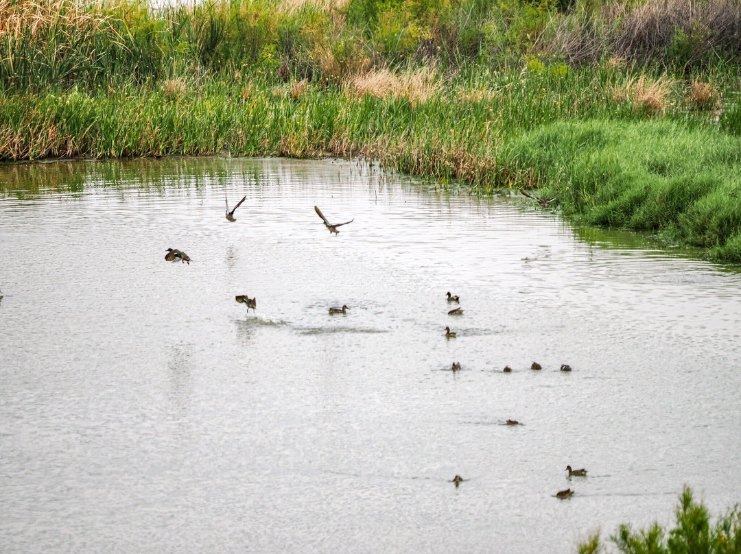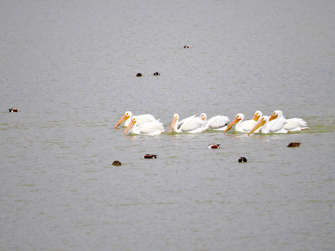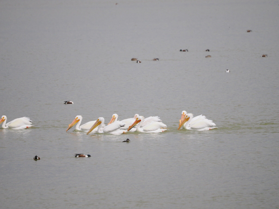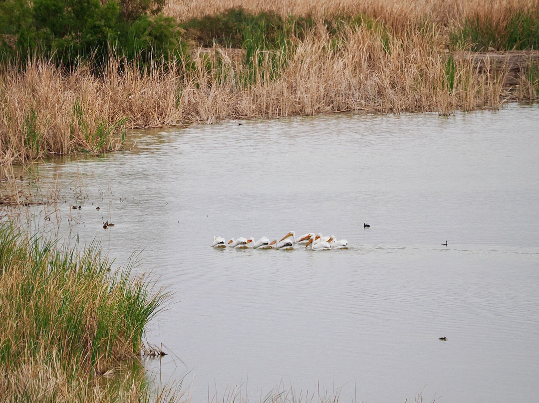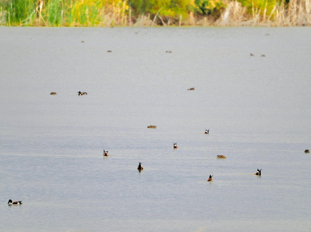 最容易识别的当然是最大的,包括大蓝鹭(其中一只飞得很近,很难看到)和许多美洲白鹈鹕,其中有几只在池塘里觅食。无数的北方琵嘴鸭散布在不同的池塘里。斑嘴鸊鷉、双冠鸬鹚、反嘴鹬和绿翅鸭也共享这片水域。我们发现的一些非水禽包括黑鹂、红翅黑鹂和北粗翅燕。
