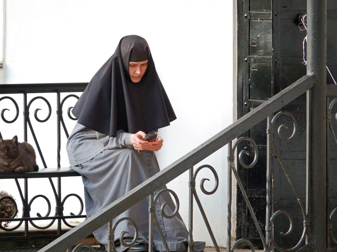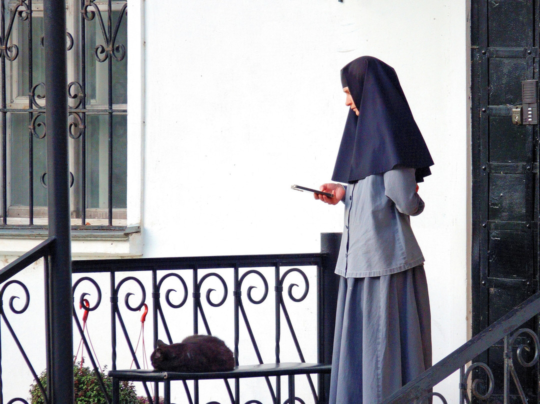 高高的围墙。修道院的庭院维护得非常好,地势略微向弗韦登斯基大教堂倾斜。从圣门到大教堂的这条小巷,以及通往博物馆和餐厅的岔路,都对外开放。其他区域则禁止入内:那里是修道士的生活场所,世俗之人不应干涉——理应如此。你偶尔可以通过相机镜头瞥见这种生活,但也只是惊鸿一瞥,而且即便如此也只是偶然。教堂内禁止拍照(因为那里没有圣化)。因此,这座修道院虽然看起来很大,但你只能窥见其冰山一角。然而,这小小的一处地方,这些寺庙(开放时),以及修道院的空气和氛围,都充满了浓厚的灵性和信仰气息,让人流连忘返。