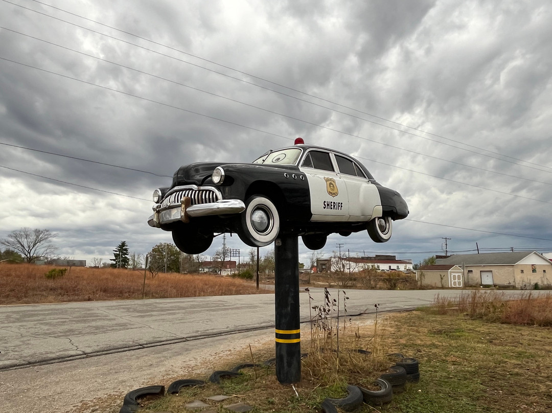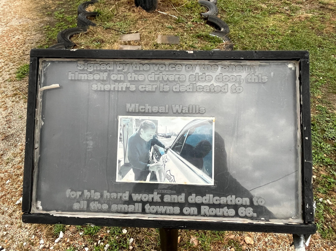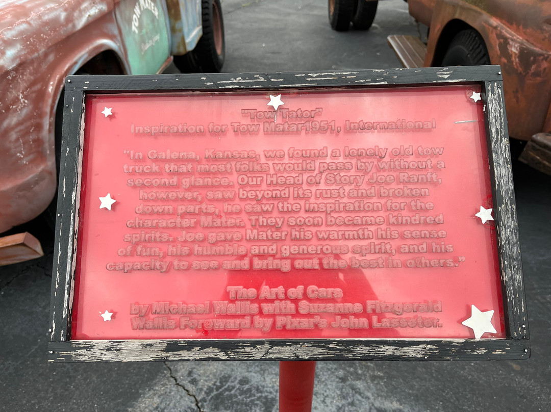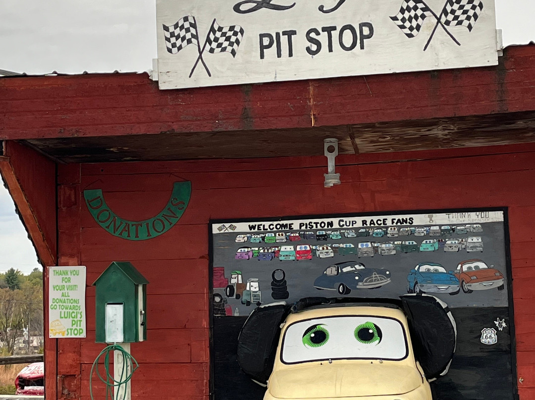 翻译:就像下面的其他评论一样,我们是在周日晚上到达这里的,里面关门了。老实说,我们对这个地方真的不太了解,也从未看过电影《汽车总动员》,这部电影基本上讲述了 66 号公路的消亡,主角是 Tow Mater,一辆倒着开的卡车。这辆卡车是动画角色以及附近警车的灵感来源。我们在里弗顿的尼尔森商店停了下来,尼尔森先生给我们讲述了皮克斯编剧来采访 66 号公路沿线寻找灵感的人的完整故事。Tow Mater 一直倒着开的原因是受到一个可以转动小腿并倒着走路的人的启发。电影中的哈德逊汽车位于您从南边进入 GearHead Curios 的路上,旁边有一个“A”字巨人。我在其他一些评论中谈到过驾车行驶 66 号公路需要多长时间,这个小镇就是一个很好的例子;您可以在这里花一整天时间拍照,参观博物馆和游客中心。这确实是一个很好的拍照机会,在下面停下来看看路易吉的商店和警车。他们制作了一个 66 号公路地下停车场,可以像位于亚利桑那州金曼的那辆一样为您的汽车加框。我们参观时他们还没有在上面刻字,但他们说他们正在筹集资金来做这件事。如果您向东行驶,请沿着原来的 66 号公路行驶,并在密苏里州的州界处拍照。我们在密苏里州乔普林的 Woody's Pizza 吃了晚餐,味道很好;这是另一个让 66 号公路重现生机的商业例子。我们在这里玩得很开心,加利纳的壁画也很棒。
