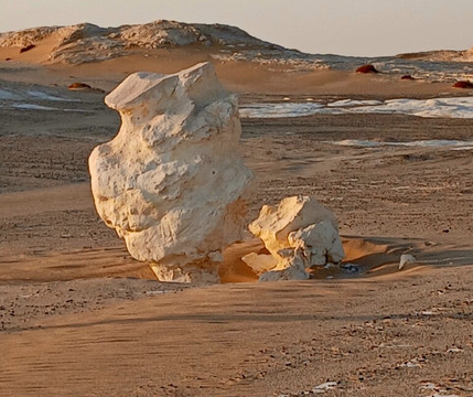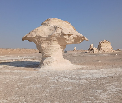 翻译:白沙漠被许多人誉为世界上最美丽的沙漠,无疑是地球上最独特、最超现实的地方之一。它位于埃及撒哈拉沙漠,介于法拉夫拉绿洲和巴哈利亚绿洲之间,距离开罗约500公里。在这里,风沙将巨大的石灰岩雕琢成各种奇特的形状,包括蘑菇和动物。